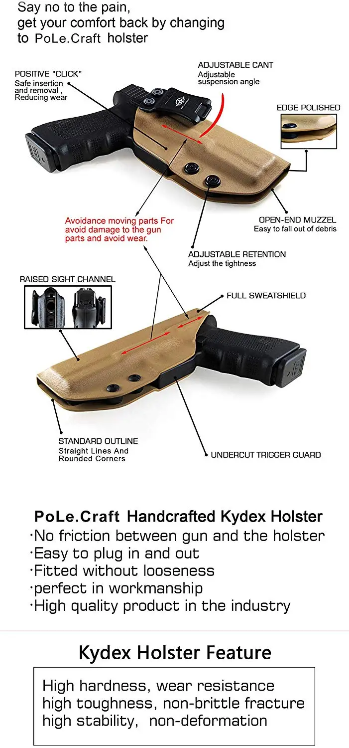 Пожизненная гарантия: мы уверенно предлагаем пожизненную гарантию, которая дает вам спокойствие при выборе PoLe.Craft IWB KYDEX Holster. Если наши продукты не работают, как обещано, пожалуйста, верните замену или полный возврат средств.