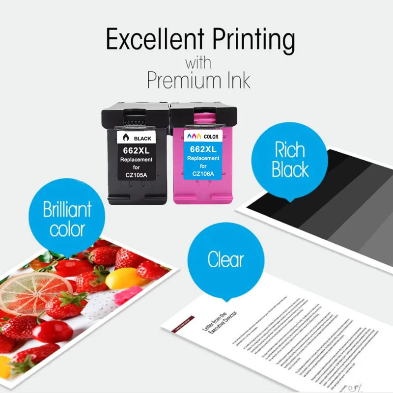Модель продукта: 662XLХарактеристика: ВосстановленныйТип чипа: отображение чипа уровня чернилЦвет картриджа: черный и трехцветный (C/M/Y)Объем: Bk-18ml, Tri-color-18mlВыход страницы: Bk 600 страниц, трехцветные 450 страниц (формат А4, 5% покрытия)Совместимый принтер:Для принтера HP Deskjet 1015 1515 2515 2545 2645 3545 4510 4515 4516 4518Здесь представлены не все модели принтеров. Если у вас есть какие-либо вопросы о том, может ли ваш принтер использовать картриджи, пожалуйста, свяжитесь с намиЕсли ваш оригинальный чернильный картридж 662 или 662XL, наш картридж подойдет для вашего принтера.