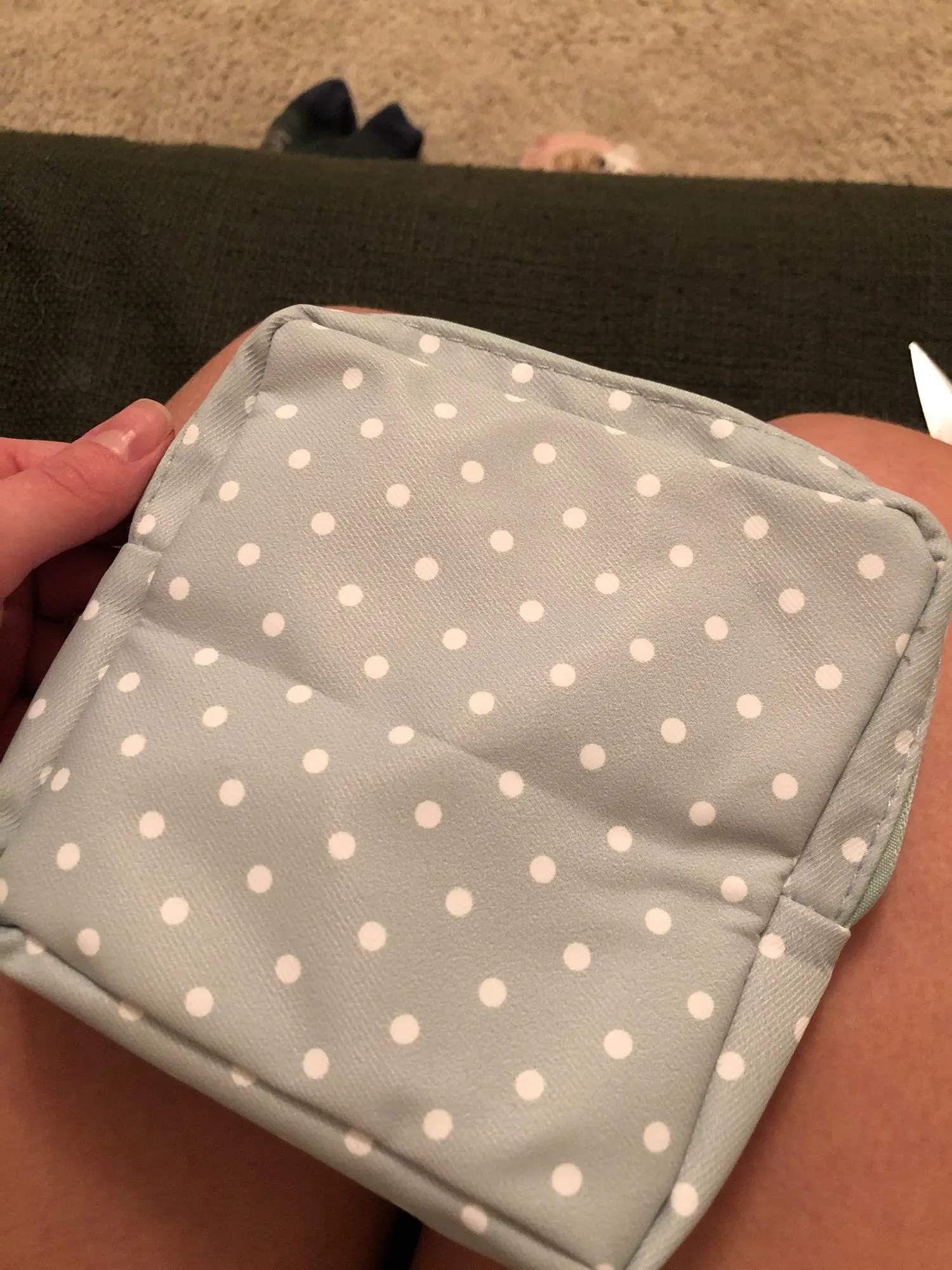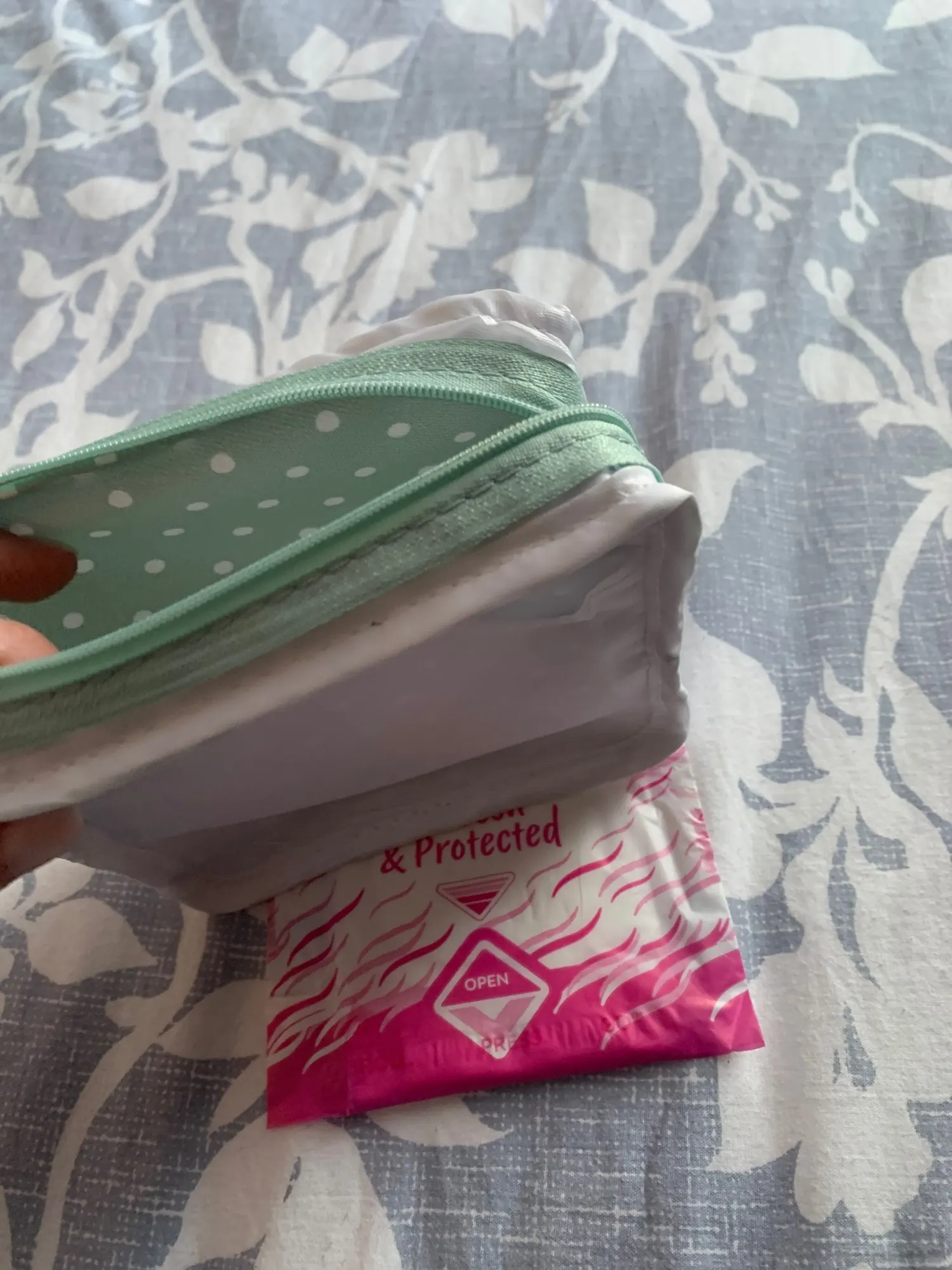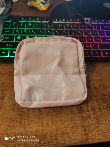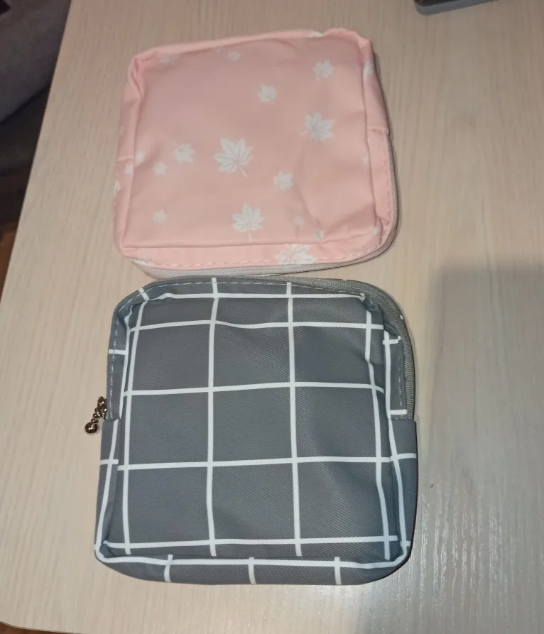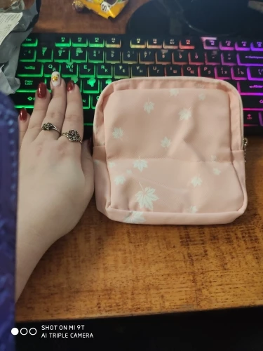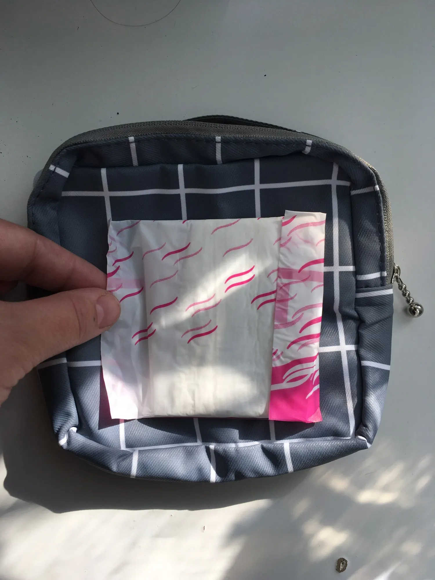 Хорошая маленькая сумочка(или пакетик?). Помешаются прокладки и даже остаётся много мест, так же помещается зарядка и наушники. Очень хорошая и вместительная.