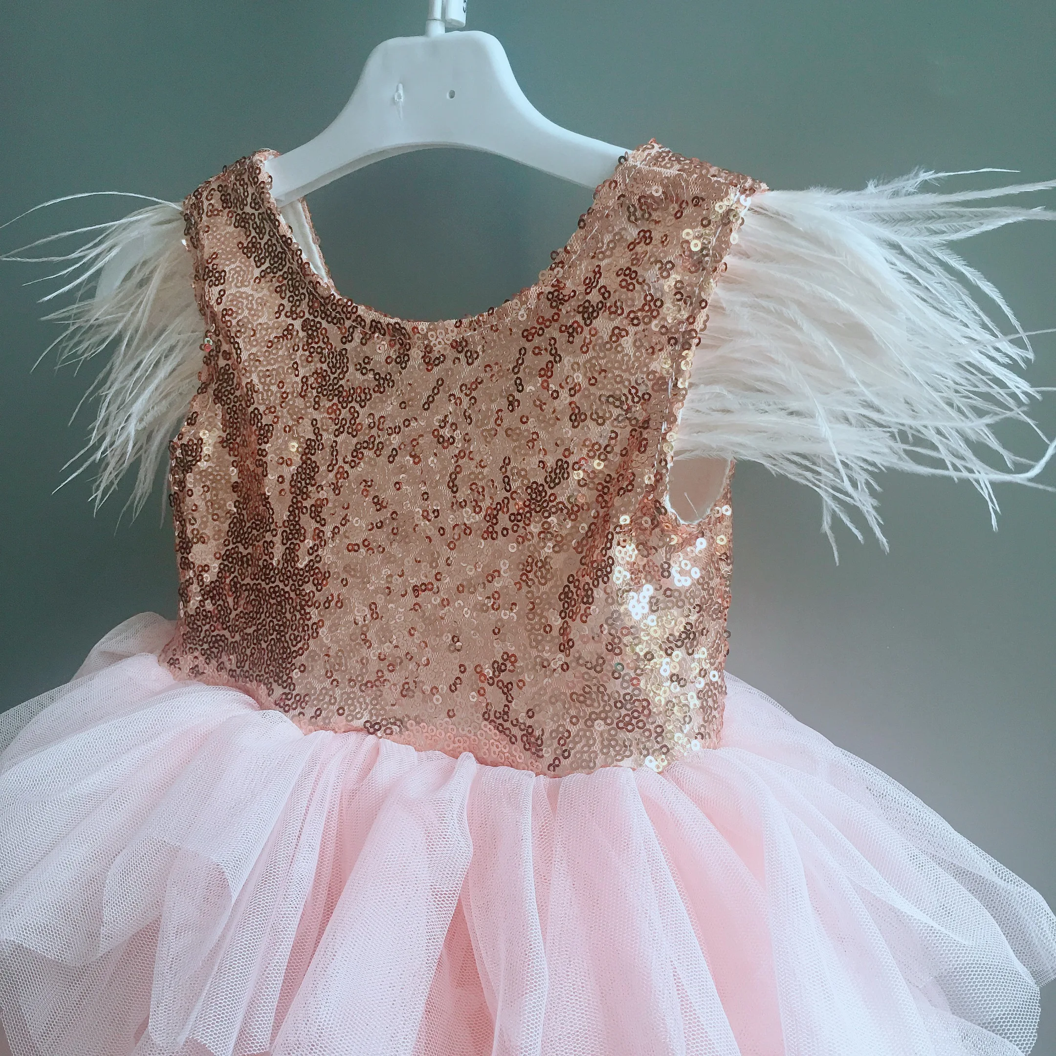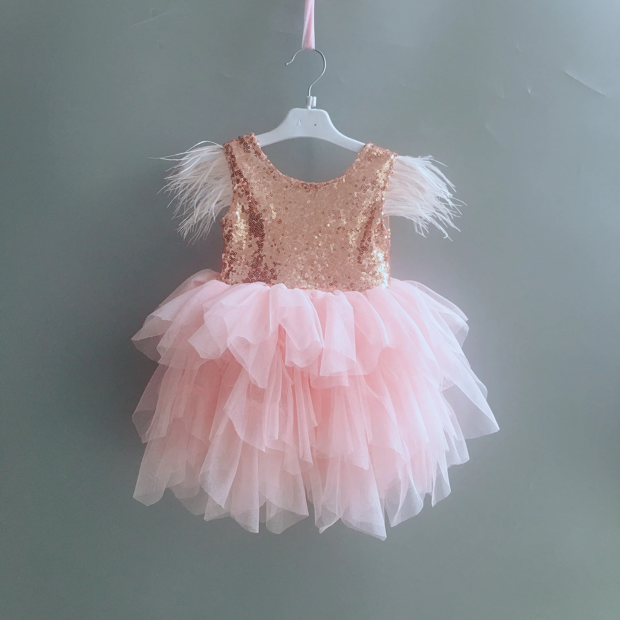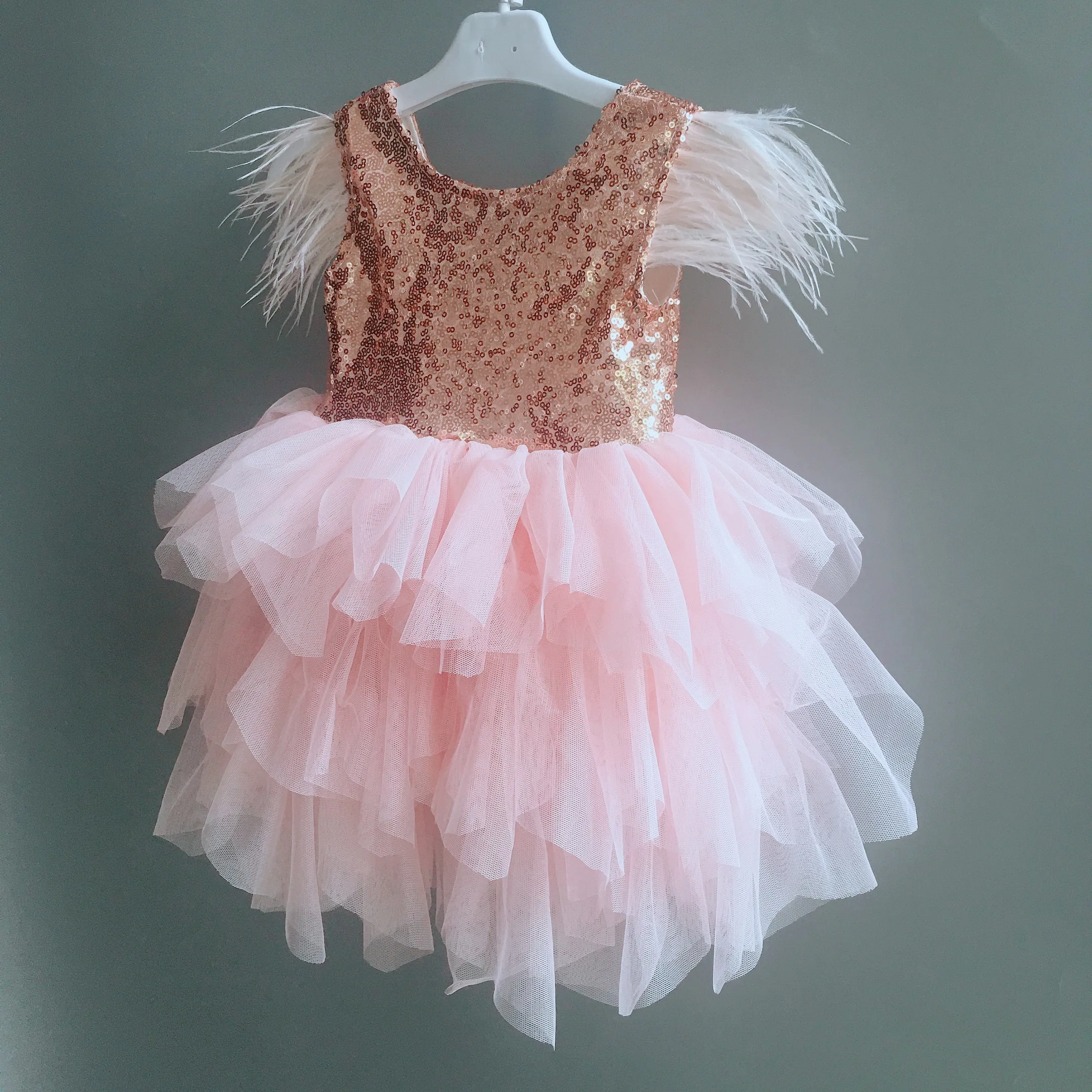 Новое платье с блестками и перьями для малышей на 1-й день рождения, летняя платье Детская Юбка-пачка Одежда для маленьких девочек