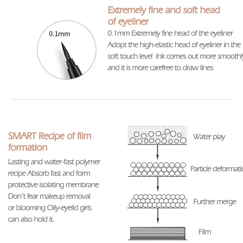 Улучшенная продукция, очень тонкая и мягкая насадка для подводки глаз, очень тонкая насадка для подводки глаз, высокоэластичная насадка для подводки глаз обеспечивает более гладкое нанесение чернил на поверхность Более беззаботно рисует линии по рецепту образования пленки, стойкий и водостойкий полимерный рецепт быстро впитывается и образует защитную изолирующую мембрану, не бойтесь снятия макияжа или цветущего маслянистого века. Девушки также могут держать его.
