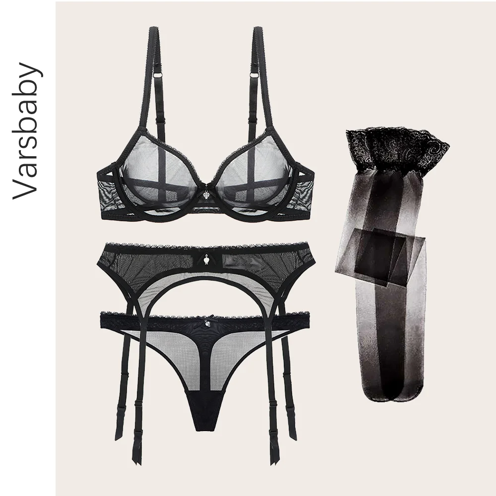 Комплект нижнего белья из 4 предметов, бюстгальтеры + подвязки + стринги + чулки