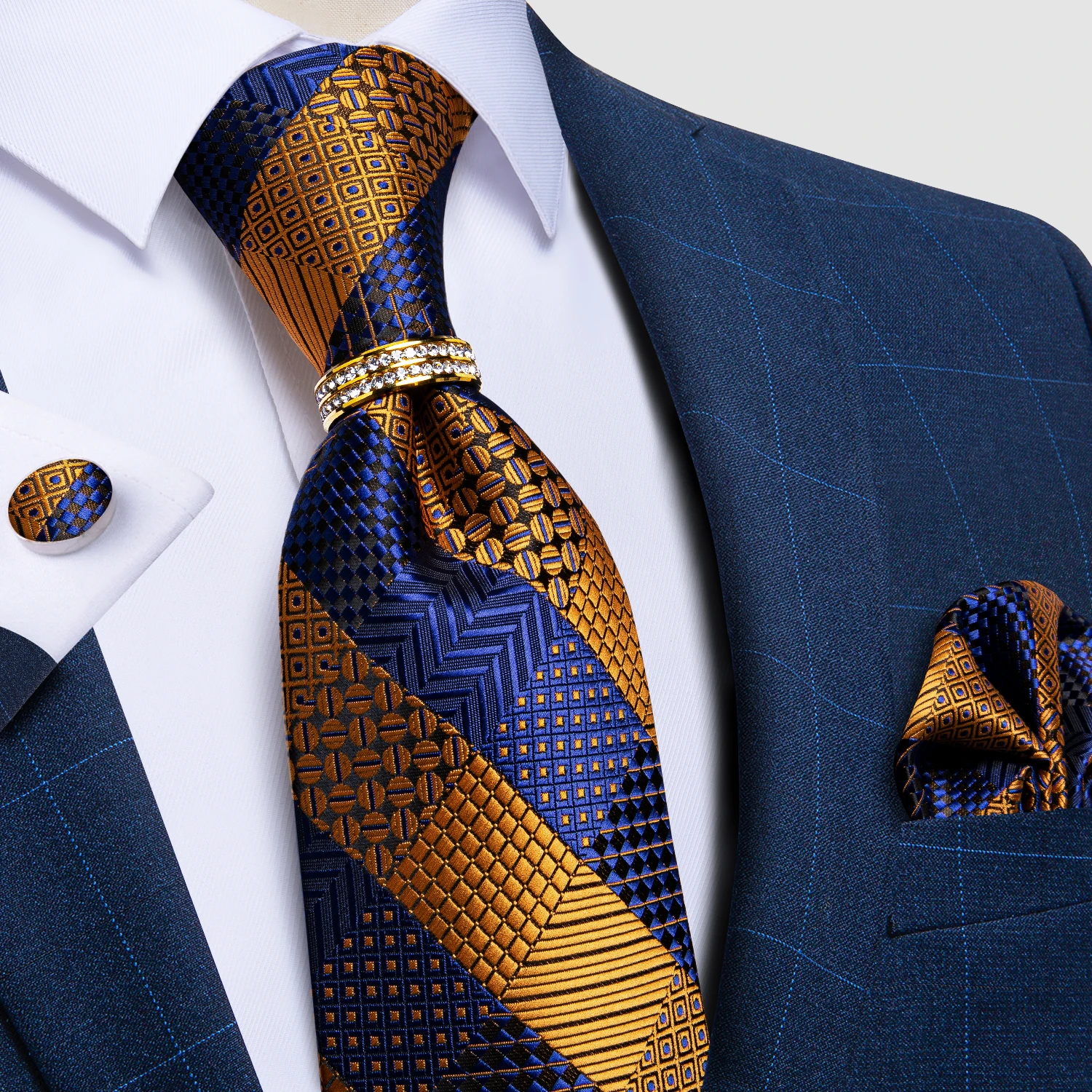 DiBanGu Мужской Шелковый Свадебный галстук золотой синий полосатый Дизайнерский Модный Галстук для мужчин галстук кольцо Hanky запонки Набор Бизнес Вечеринка