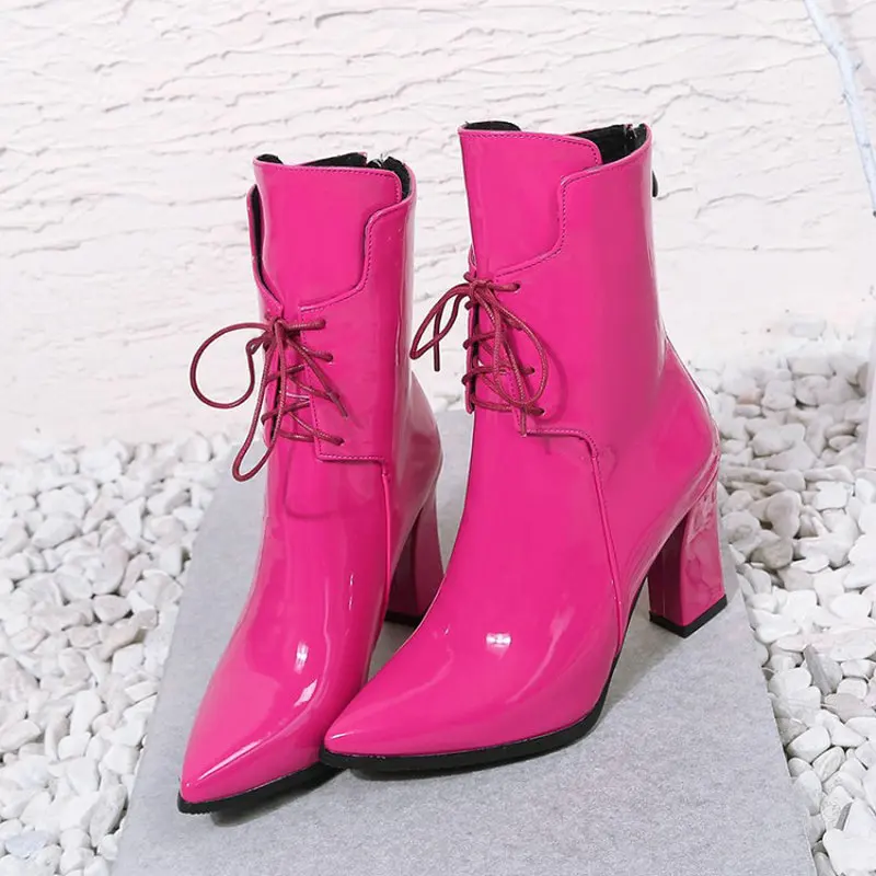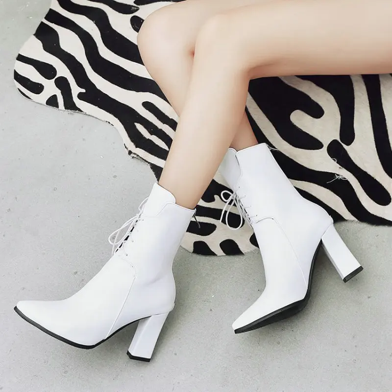 Женские ботильоны из искусственной кожи Sianie Tianie, белые ботильоны из лакированной искусственной кожи, с острым носком, на высоком блочном каблуке, на шнуровке, 2020