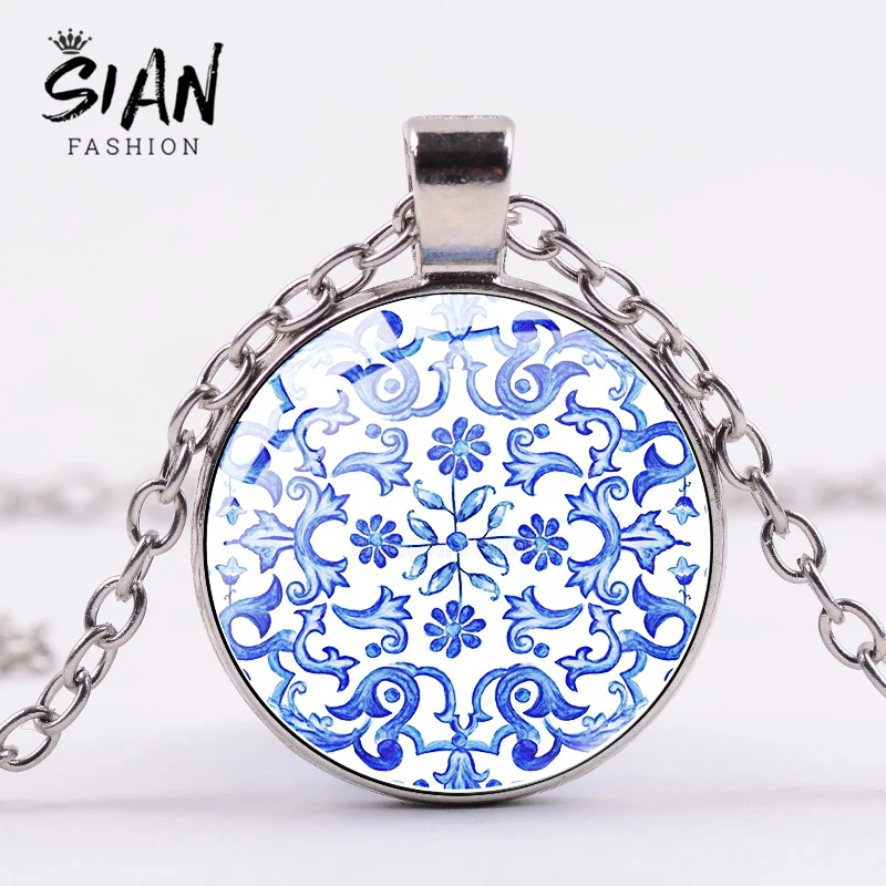 Красивое художественное ожерелье с цветочным дизайном сине-белое фа...