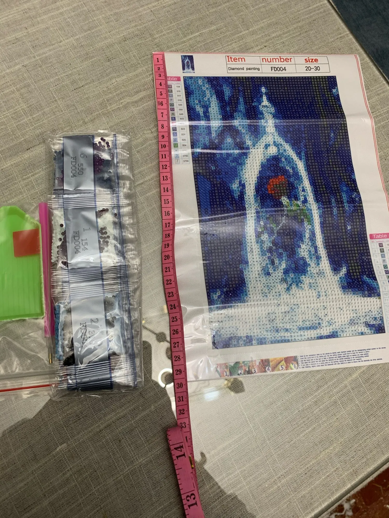 Измерение изображения меньше, чем написано. It is 20x30 with the frame included, while it should be 20x30 Only The Picture. Комплект завершен, но ему не хватает вещей, таких как пинцет, и карандаш имеет только одну точку. Качество изображения нормальное. Хорошо для начала, но я бы не стал покупать снова.