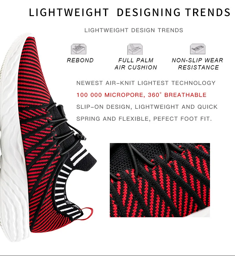 Легкие тенденции дизайна, новейшая воздухопроницаемая легкая технология 100 000 микропор, воздухопроницаемая конструкция без шнуровки на 360 °, легкая и быстрая пружина и гибкость, идеальное облегание стопы