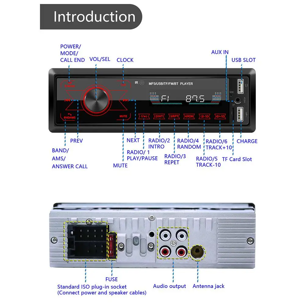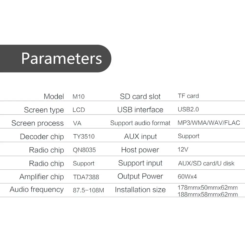 1. Функции Bluetooth и AUX2. Цифровое высококачественное FM-стерео радио (FM87.5 ~ 108 МГц)3. Поддержка чтения карт и U-дисков (аудио)4. Поддержка аудио: MP3 / WMA / WAV / FLAC5. Дизайн сенсорного экрана6. Аудиовыход RCA можно подключить к сабвуферу7. Поддержка дистанционного управления дальним радиусом действияХарактеристики:Тип: автомобильный стерео MP3-плеерСпециальная функция: FM-радио, Bluetooth, звонки в режиме громкой связи, mp3-плеер, AUX, Двойная зарядка через USB, дизайн с полным сенсорным экраномМодель: M10Напряжение: 12 ВОС: нетПрограммное решение: SC3510Чип усилителя: TDA7388Тип экрана: Полный сенсорный ЖК-экранРазмер панели: около 188*58 мм/7,40*2,28"Светильник панели: цветной светильникРазмер цветной коробки: около 220*82*181 мм/8,66*3,23*7,13"Глубина хоста: около 60 мм/2,36 дюймаВес одной машины: около 400 гРадиодиапазон: FMРадиочип: Интеграция чипаМощность: 4*60 ВтSNR (дБ): ≥ 60 дБСтепень искажения (%): ≤ 0.3%Чувствительность: менее 20 дБСтерео разделение: более 25 дБРабочая температура: -10 ~ 60 ° CМодель Bluetooth: AUTOTOBTВерсия Bluetooth: 4,0Радиочастота: 87,5 ~ 108 МГцСлот для карты TF: ДаПульт дистанционного управления: ПоддержкаИнтерфейс и Версия USB: USB2.0Кнопка: Физическая кнопкаВведение в Терминал RCA: 4-канальный аудиовыходАудиовход AUX: ДаФункция соединения сотового телефона: не поддерживаетсяПоддерживаемые Аудиоформаты: MP3 / WMA / WAV / FLACУпаковочный лист:1xmp3-плеер1 шнур питания1x пульт дистанционного управления2X разборный ключ1x ИнструкцияПримечания:1. Этот плеер 12 В, что не соответствует потребляемой мощности 24 В2. Возможны погрешности в размерах из-за ручного измерения, различных методов измерения и приборов.3. Изображение не совпадает с фактическим цветом изделия из-за разницы в фотографировании, угле и мониторе.