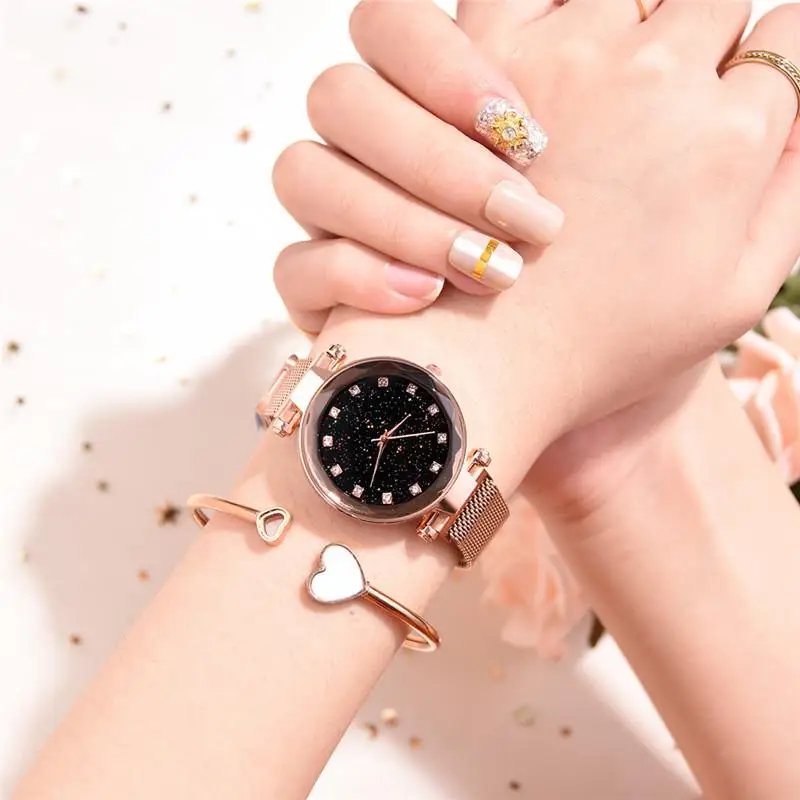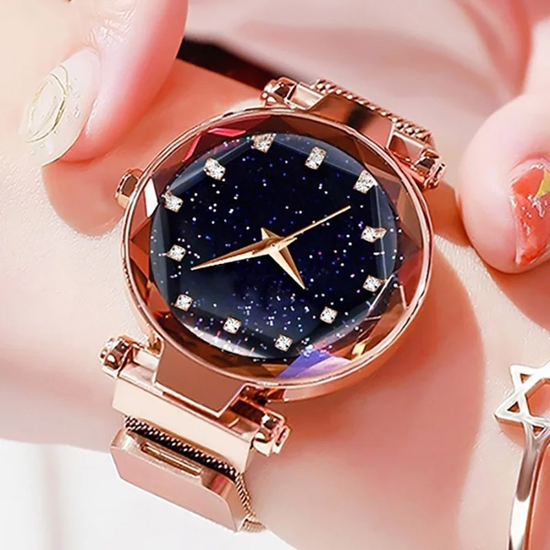 Часы женские кварцевые с сетчатым браслетом, Роскошные наручные, со стразами, с изображением звездного неба, розового и красного цветов, стразы, подарок для женщин, 2020