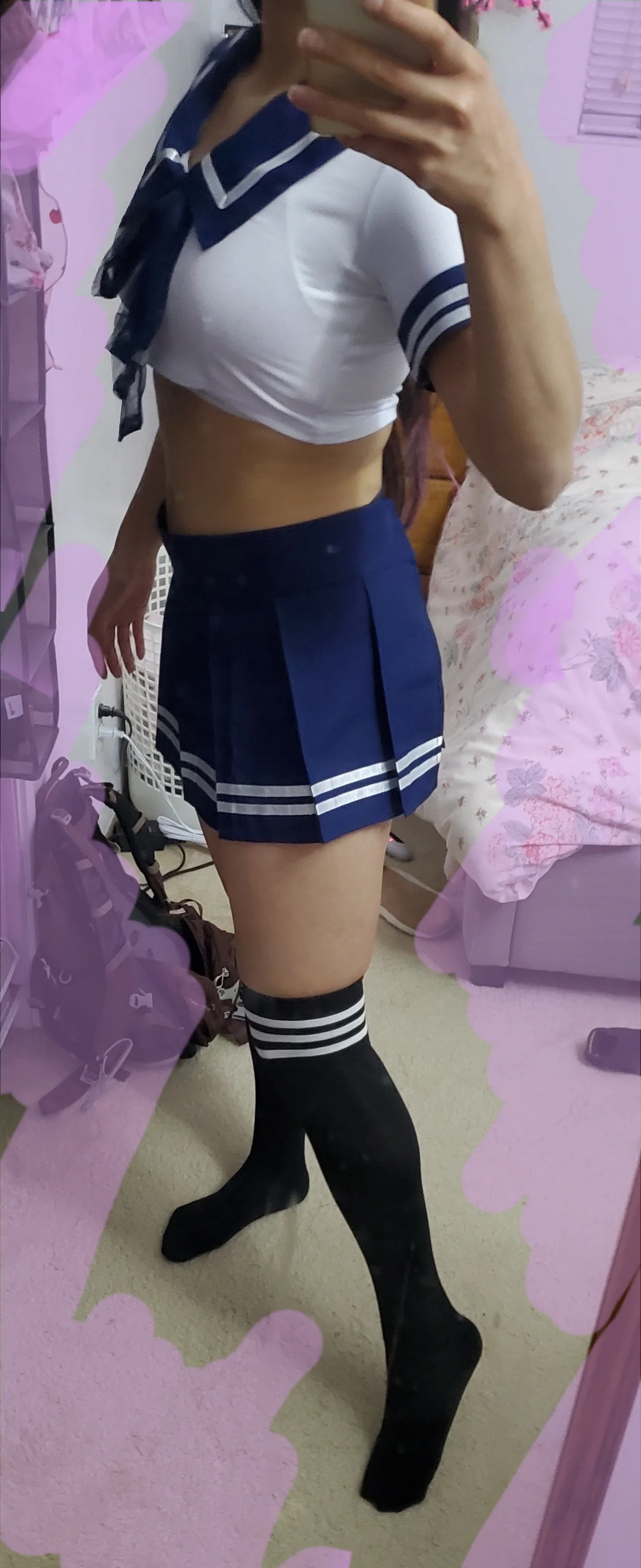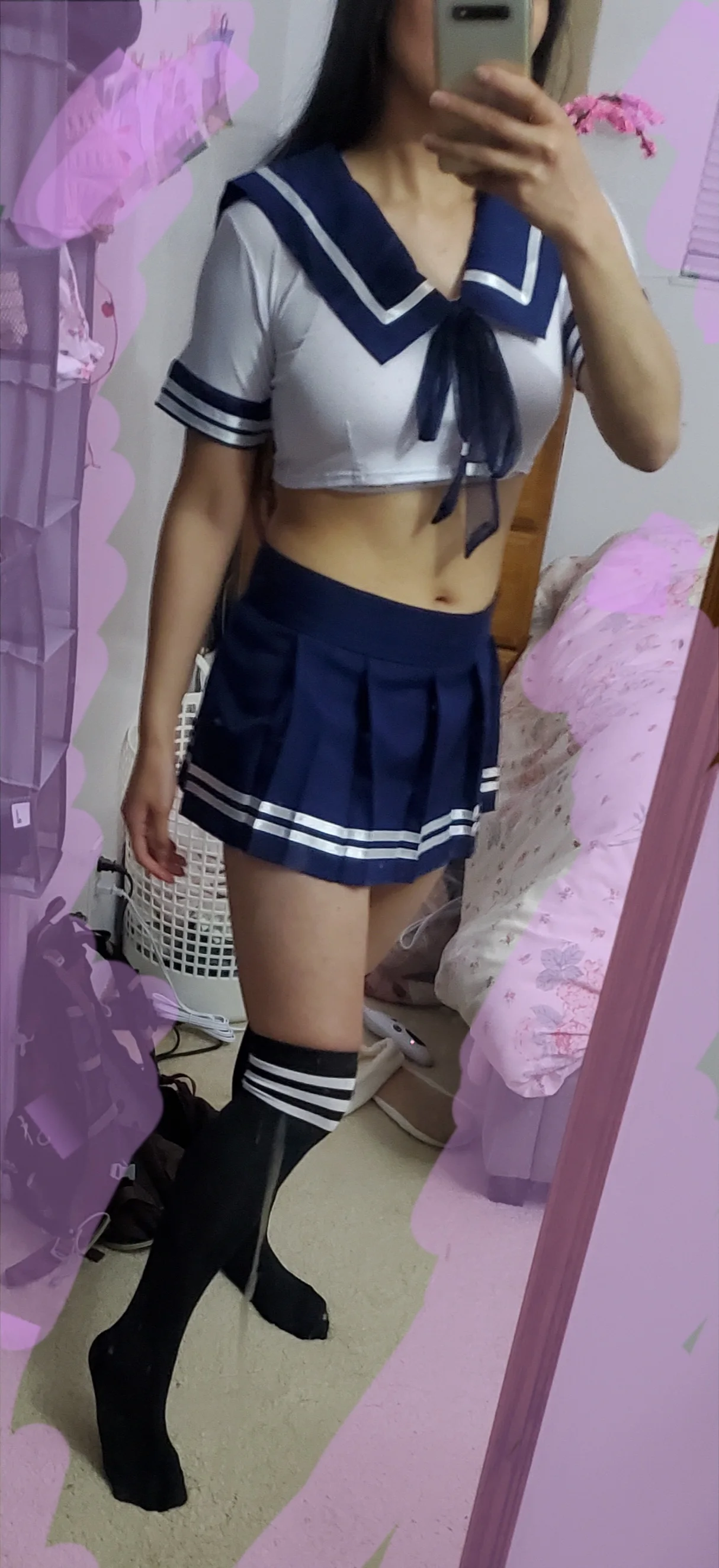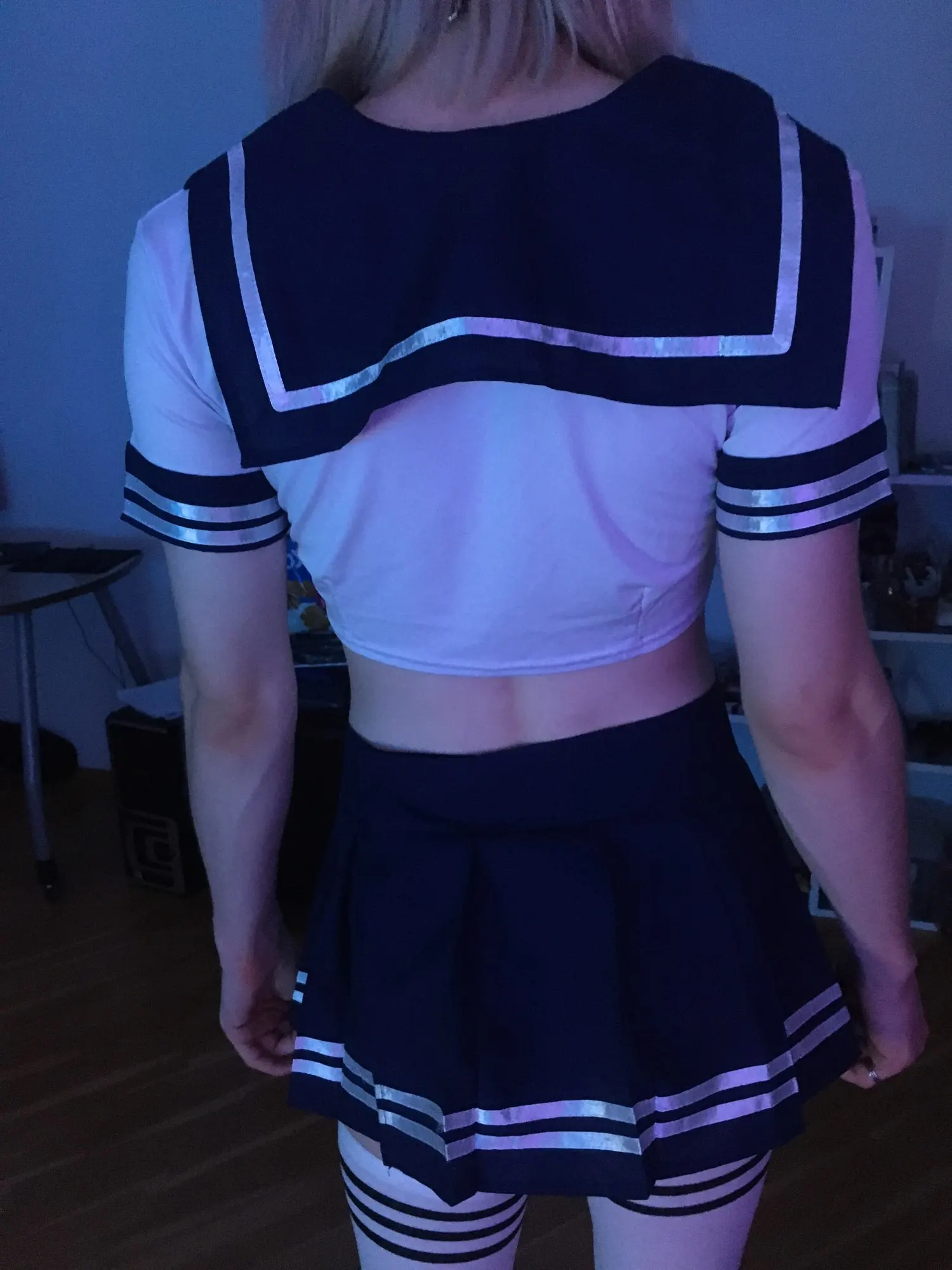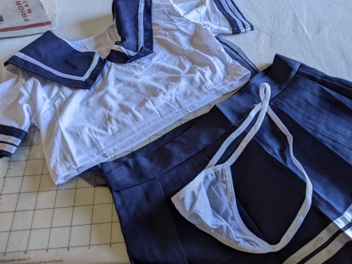 Это действительно мило и сексуально. Топ мягкий и удобный, почти как футболка. Юбка имеет застежку-липучку и может быть скорректирована, чтобы соответствовать вашей талии. Я купил чулки отдельно. Моя талия 28 дюймов для справки.