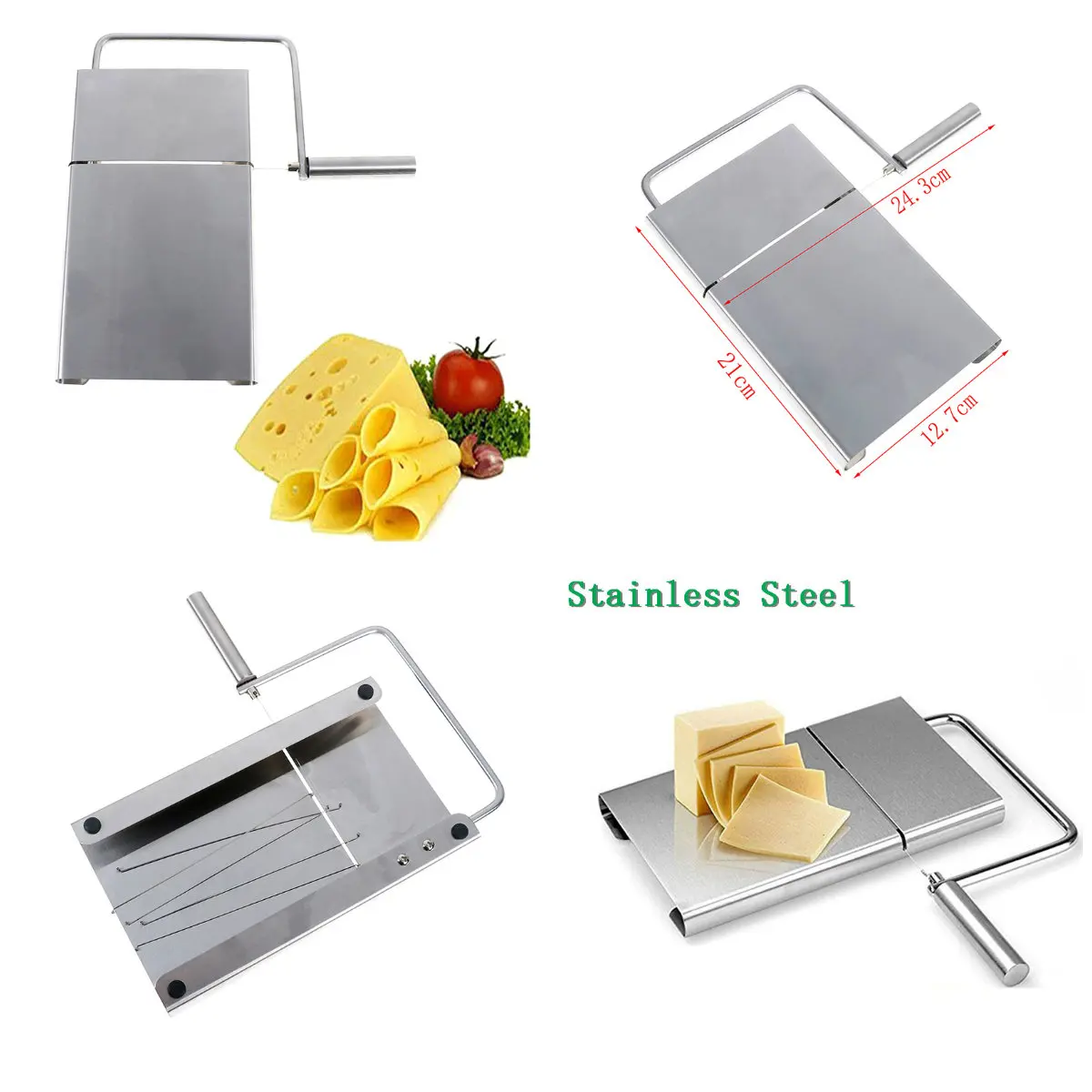 Описание: Изготовлен из нержавеющей стали 430, не ржавеет и устойчив к коррозии. Нанесите Новое проволочное лезвие, чтобы нарезать жесткую еду, как сыр. Основа действует как разделочная доска для хранения сыра. Ручка обеспечивает удобный захват, вы можете легко нарезать сыр. Слайсер используется для Cheddar, для Mozzarella или аналогичного типа мягких сыров. Легко моется водой и мягкой тканью. Технические характеристики: 100% Новинка и высокое качество Цвет: серебро Материал: Нержавеющая сталь Размер: как показано на фотографии