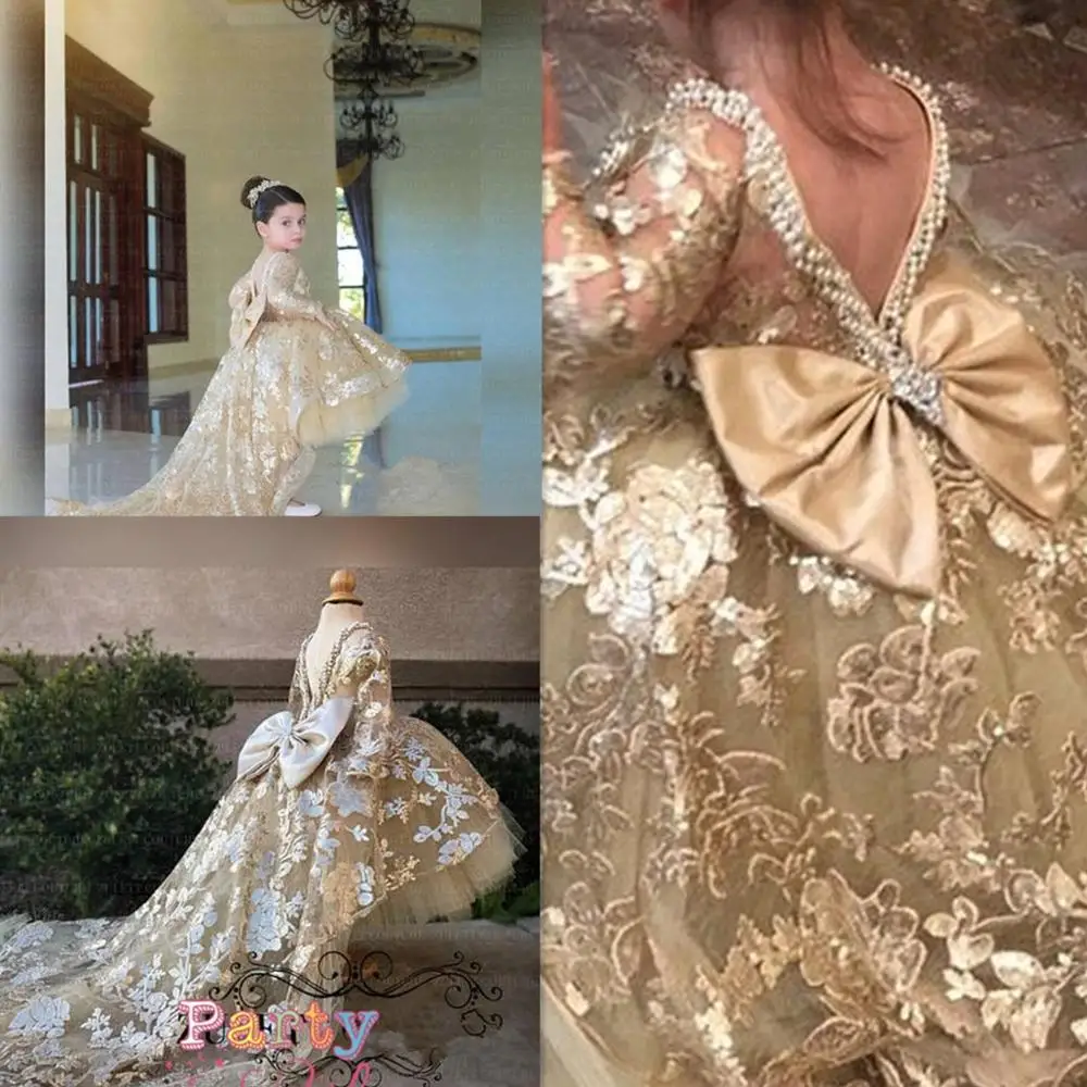 Платье для девочки с золотыми кружевами и аппликацией, с бантом и п...