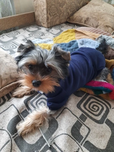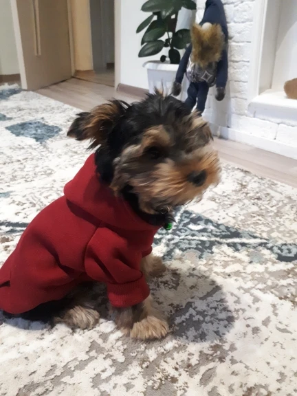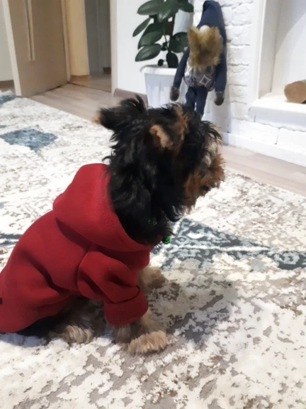 Размер XS подошёл для трехмесячного Йорка, есть ещё запас. Качество хорошее, нитки не торчат, швы аккуратные, доставка быстрая, около 2-х недель. Толстовка из футера с начесом.