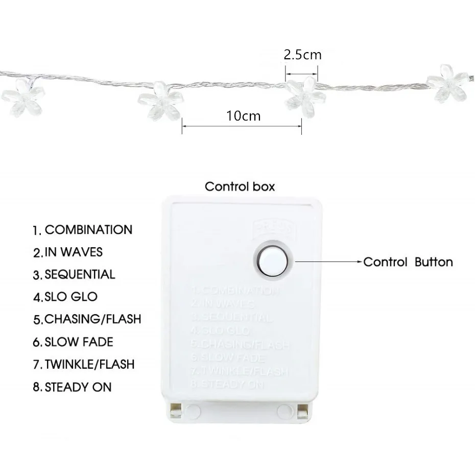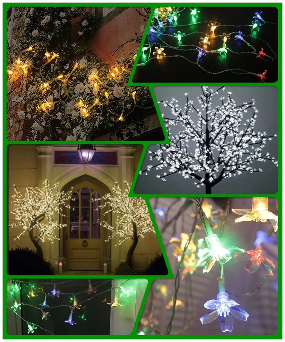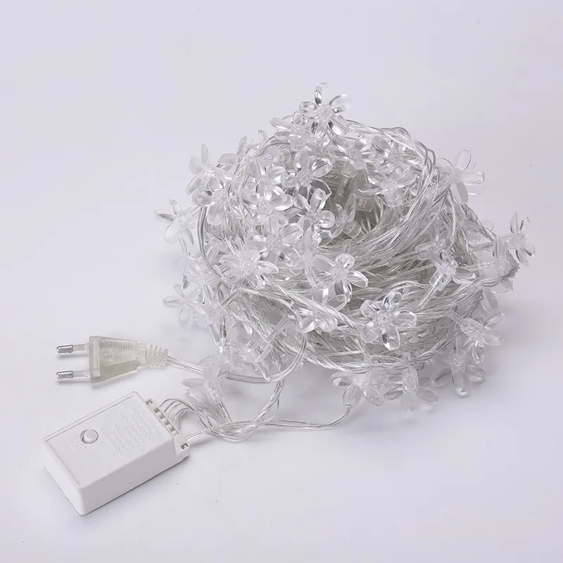 Характеристики: 1, светодиодный Цветок Диаметр: 2,5 см. 2. Светодиодный интервал цветков: 10 см. 3. Цвета: теплый белый, 1. Светильник длиной 10 м 2, Количество из светодиодный цветов: 10 м 100 светодиодный s 3. Настройка режимов воспроизведения: постоянная яркость и вспышка Мощность 2-вилка (ЕС штекер вход 200-240 В) 1. Светильник длиной 10 м 2, Количество из светодиодный цветов: 10 м 100 светодиодный s. 3. Настройка режимов воспроизведения: 8 различных режимов изменения (комбинация, в волнах, последовательных, долгах, погоне/вспышке, медленном выцветании, мерцании/вспышке и устойчивом включении).
