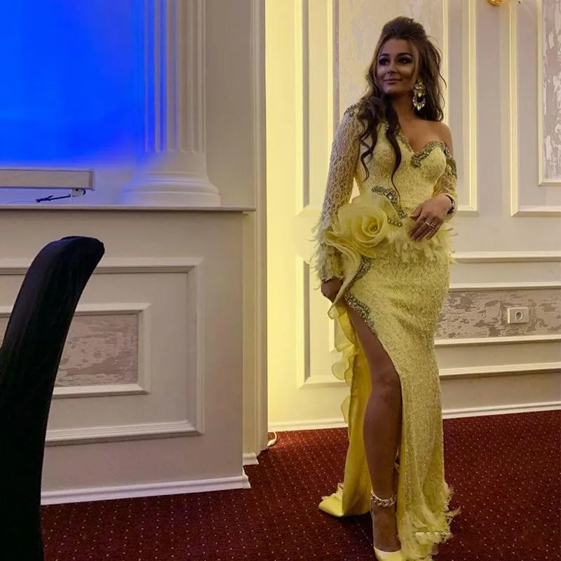 Жёлтое кружевное платье на одно плечо, с длинным рукавом, с перьями