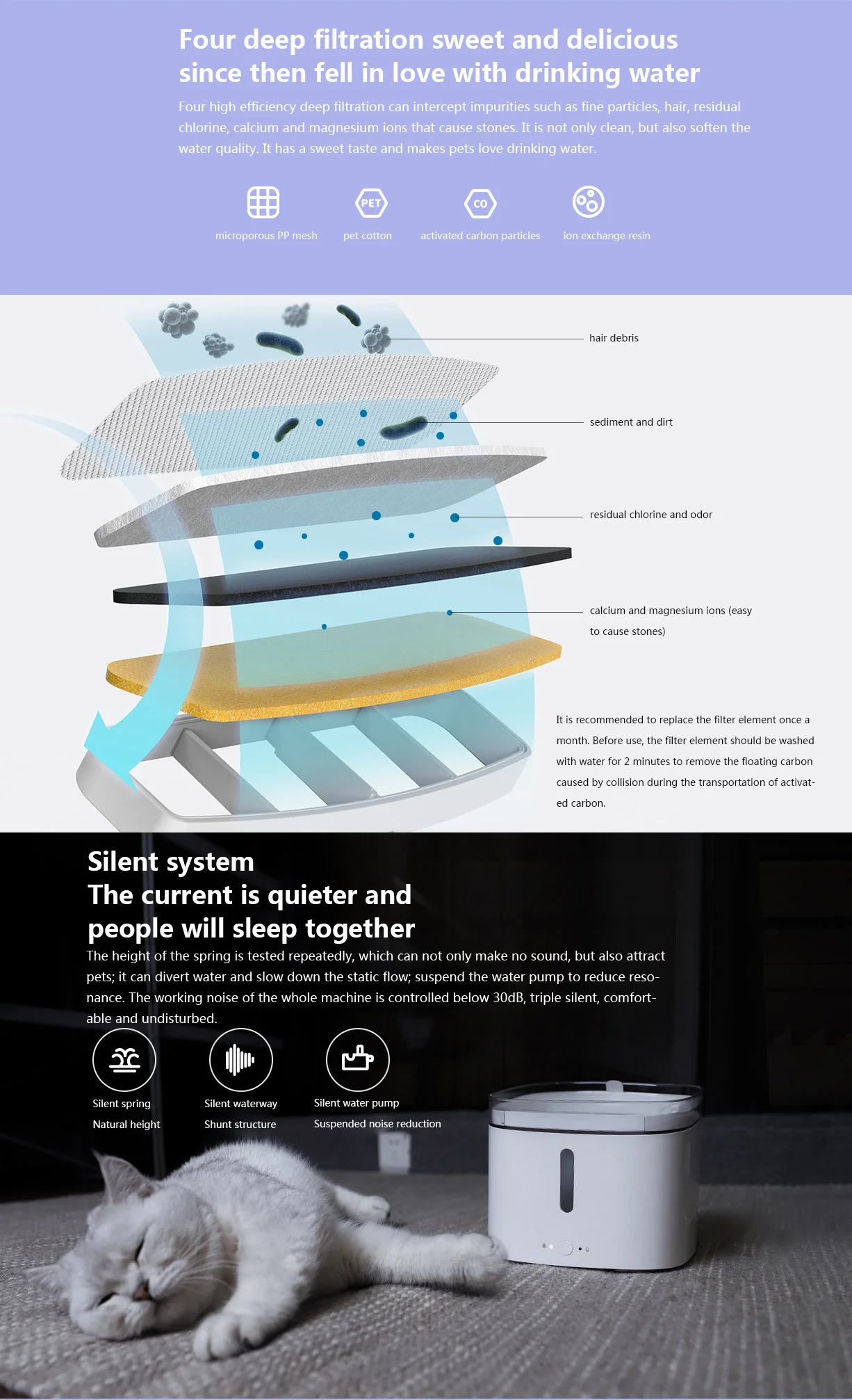 Диспенсер для воды имеет емкость 2л, что может удовлетворить взрослого кота водой около 4-7 дней. Верхняя крышка может хранить воду и может обеспечить небольшое количество аварийной питьевой воды, даже если питание отключено.