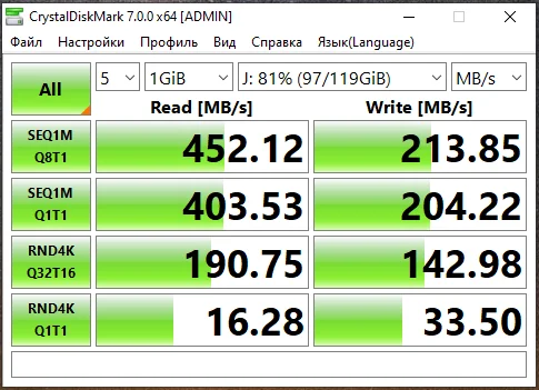 Все нормально, продавца рекомендую. Скорость и объем соответствуют. Без разницы в USB3 или USB3.1 - скорость одинаковая. B USB2 скорость будет уже 34.38 и 44.04 и это понятно почему. Не сильно нагревается, так как корпус из алюминия и это достоинство ее !
