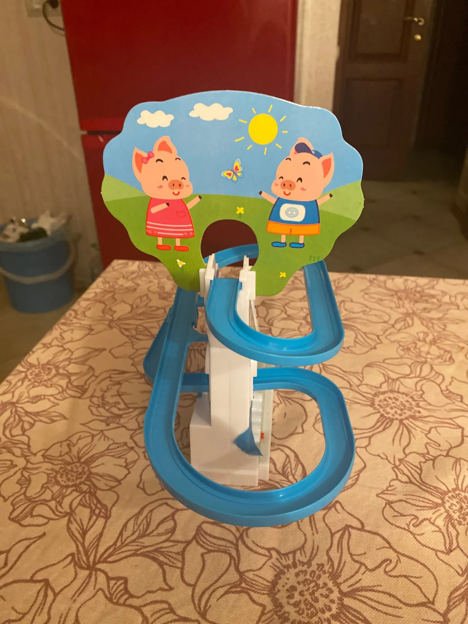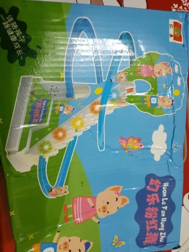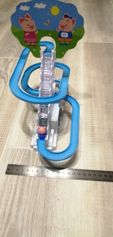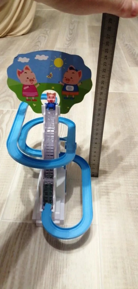 Посылка пришла через 26 дней в Омскую область, г. Тара. Коробка немного помята. Игрушка целая, в разобранном виде поступила. Установка дорожки много времени не заняла и сложности не составила. Размер не большой. Батареек в комплекте не было, поэтому в работе не пробовала. Свинка длиной 270 мм.