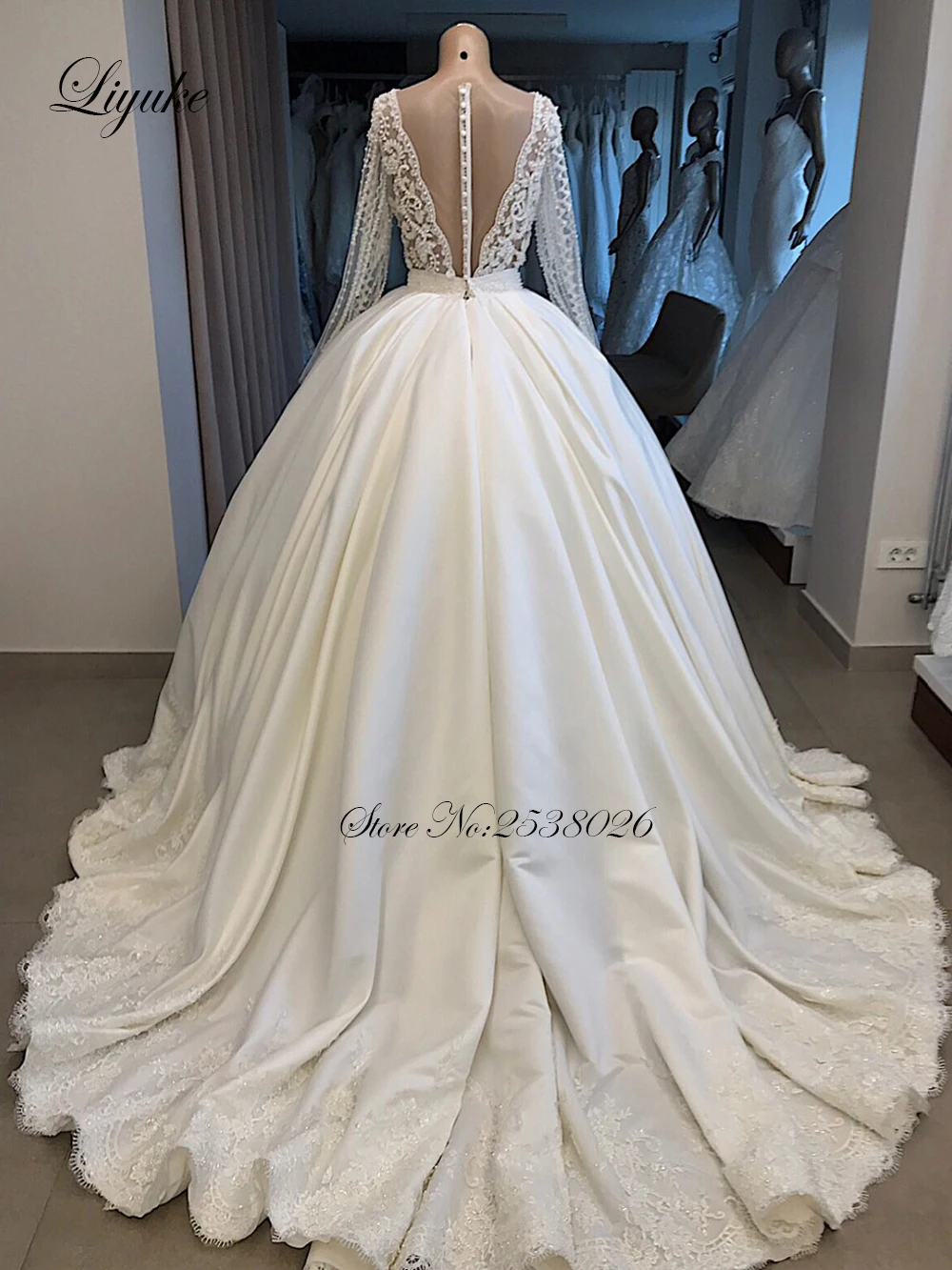 Liyuke реальные фотографии ТРАПЕЦИЕВИДНОЕ свадебное платье цвета слоновой кости атласная юбка с длинным рукавом Bling Plearls свадебное платье