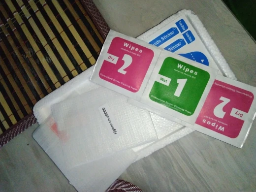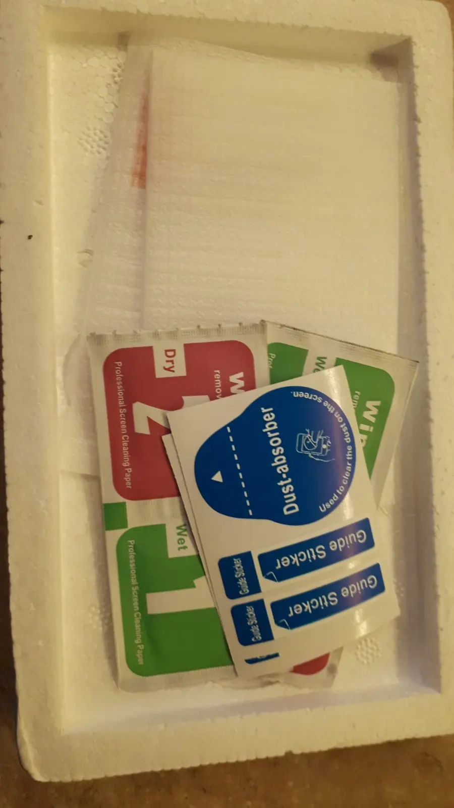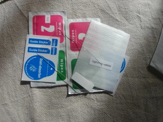 Экран нормальный. Упакован отлично в пакет с пупырышками и пенопластовую коробку. Состав комплекта хорош, см. на фото. Это два экрана (удивлен и обрадован - это здорово, если один по неопытности неправильно присандалишь, можно сделать заново с учетом негативного опыта), по две пары бумажных салфеток влажных и сухих, липкие стикеры, чтобы убрать крупную и мелкую пыль.