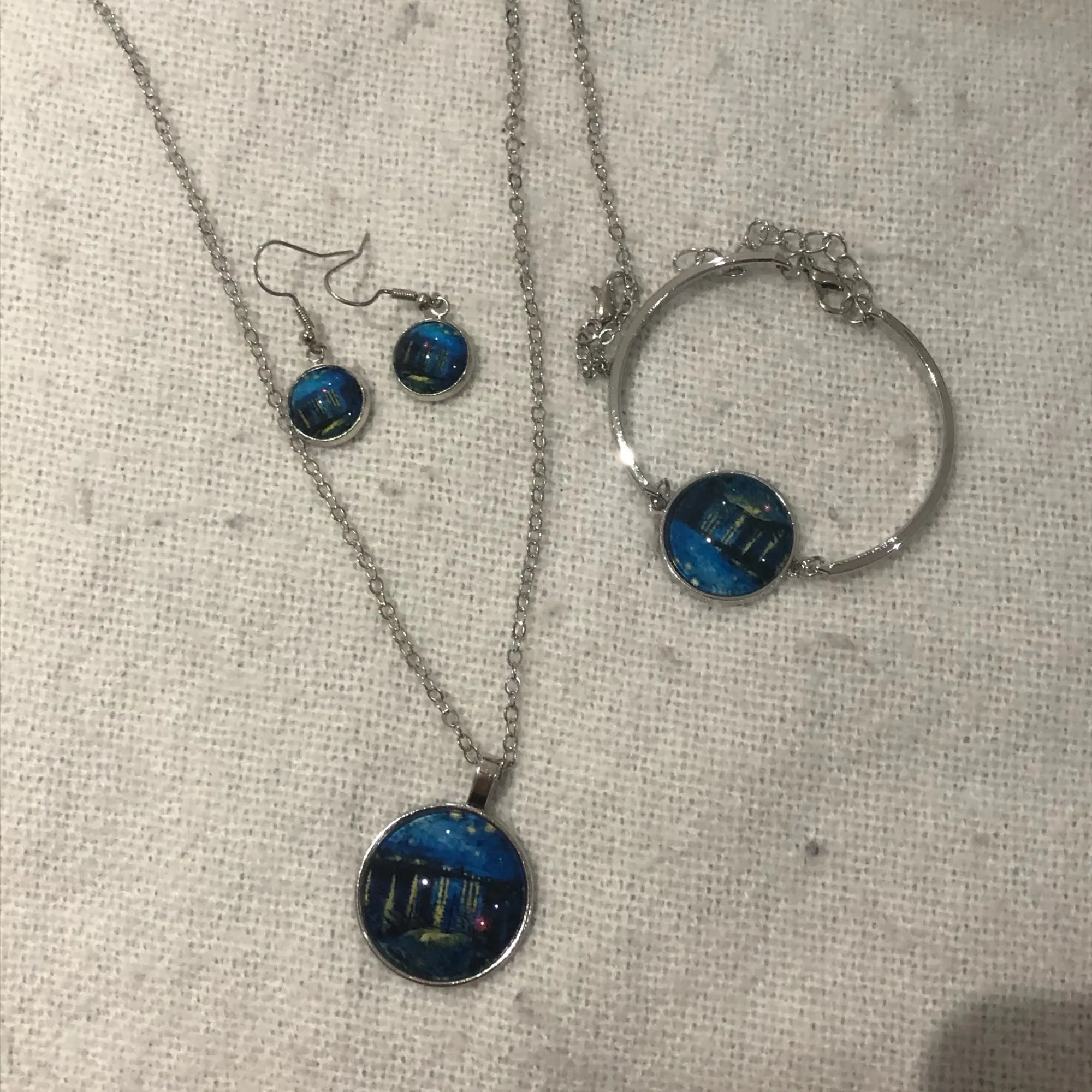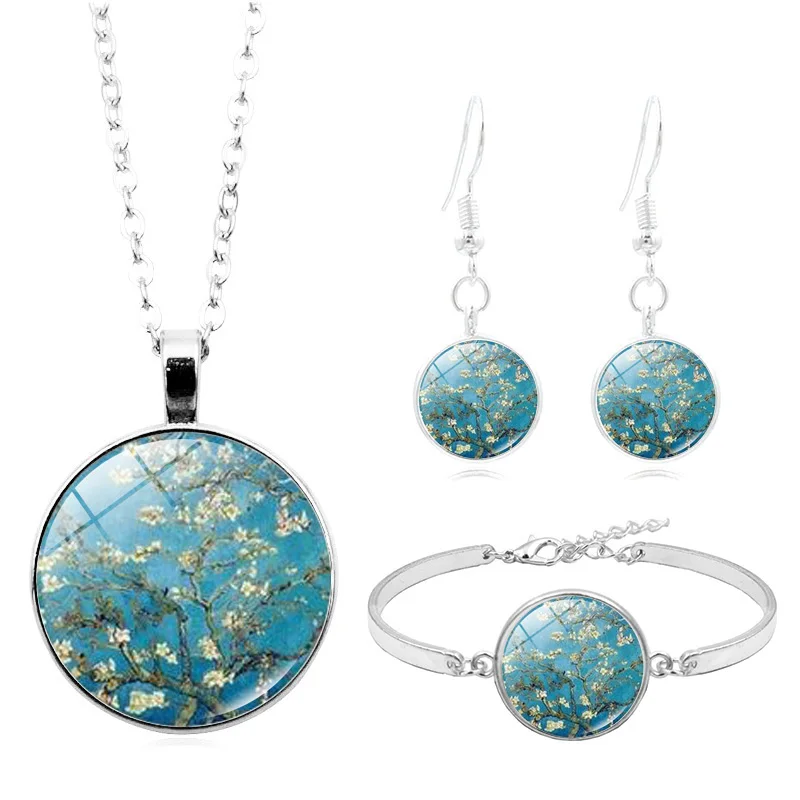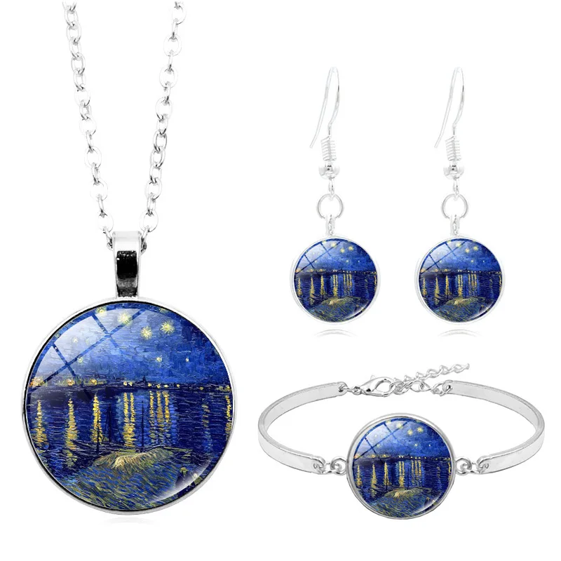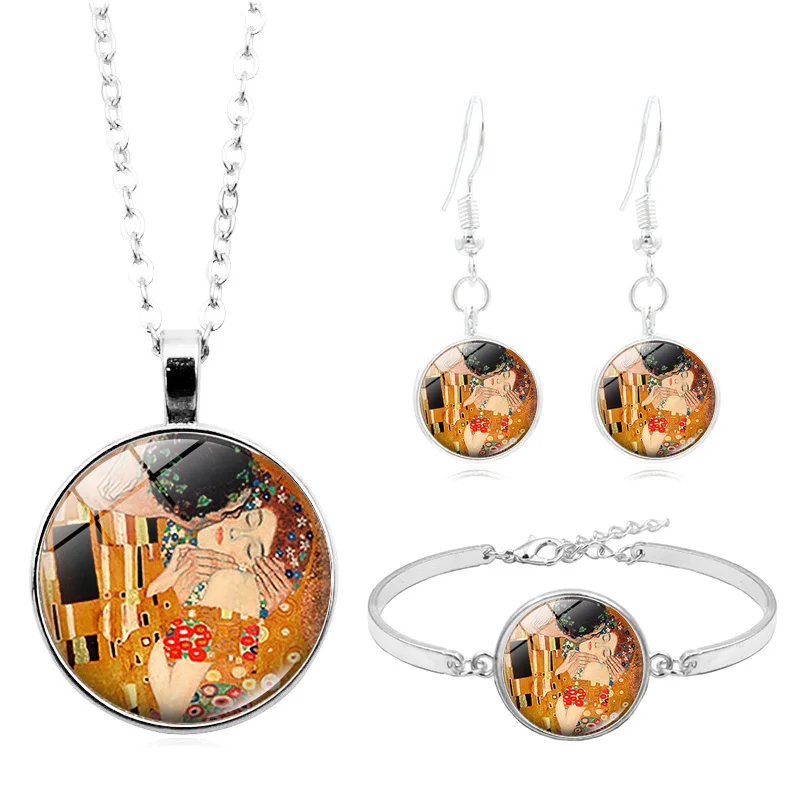 Ювелирные наборы Густав Климт, поцелуй, Ван Гог, звездная ночь, стеклянный кабошон, ожерелье, серьги, браслет, набор для женщин, подарок