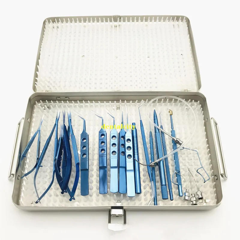 Описание катаракты 21 шт. Особенности: 1 ножницы для роговицы 2 изогнутых ножницы для катаракты 3 изогнутых держателя микроиглы 4 прямые ножницы Vannas Прямые изогнутые ножницы 5 ванн 6 ПРЯМЫХ щипцов для роговицы 7 пинцеты для капсулорексиса изогнутые, круглые наконечники 8 зажимных щипцов с коротким углом 9 прямых зажимных щипцов, прямая платформа 10 прямых зубчатых щипцов прямые Зубчатые Щипцы 11 держатель лезвия с пружиной 12 инфузионный наконечник Одной головки катаракты конуса 13 ирисовая лопатка 14 наконечник в форме прижимного шара 15 фиксирующий крюк IOL 16 IOL фиксирующий крюк Т-типа Наконечник петли 17 линз 18 коаксиальный I/A канюля апертура 0,3 мм 19 задней капсульный полировщик с коротким углом 20 ирисовый шпатель 21 глазное зеркало проволочное зеркало