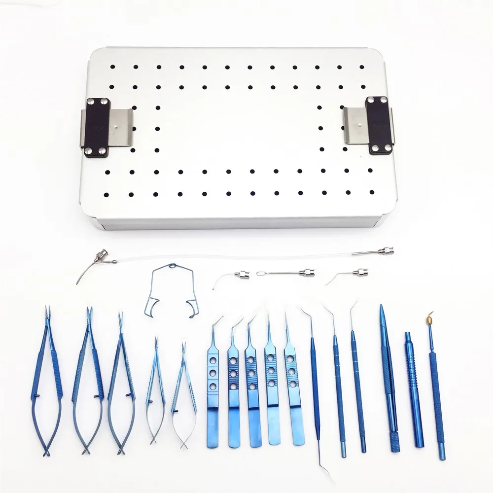 Описание для катаракты 21 шт. Особенности: 1 ножницы для роговицы 2 катаракты ножницы память изогнутые наконечники 3 Микро-игольчатый держатель изогнутый Прямые Ножницы 4 Vannas Прямые изогнутые ножницы 5 ванн 6 спиральных щипцов роговицы прямые 7 пинцеты для капсулорексиса изогнутые, круглые наконечники 8 зажимных щипцов с коротким углом 9 зажимных щипцов прямые, платформа прямые 10 прямых зубчатых щипцов 11 держатель лезвия с пружиной 12 Настой наконечник катаракты с одной головкой конуса 13 Ирис Шпатель 14 наконечник в форме шара 15 IOL фиксационный крючок 16 IOL фиксация Крюк T тип Наконечник петли объектива 17 18 коаксиальный диафрагма I/A Cannula 0,3 мм 19 Posterior капсула полировщик короткий угловой 20 Ирис Шпатель Тип смыва 21 спектральная проволока для глаз
