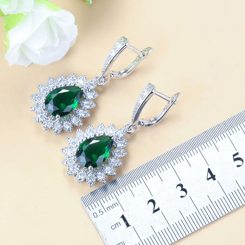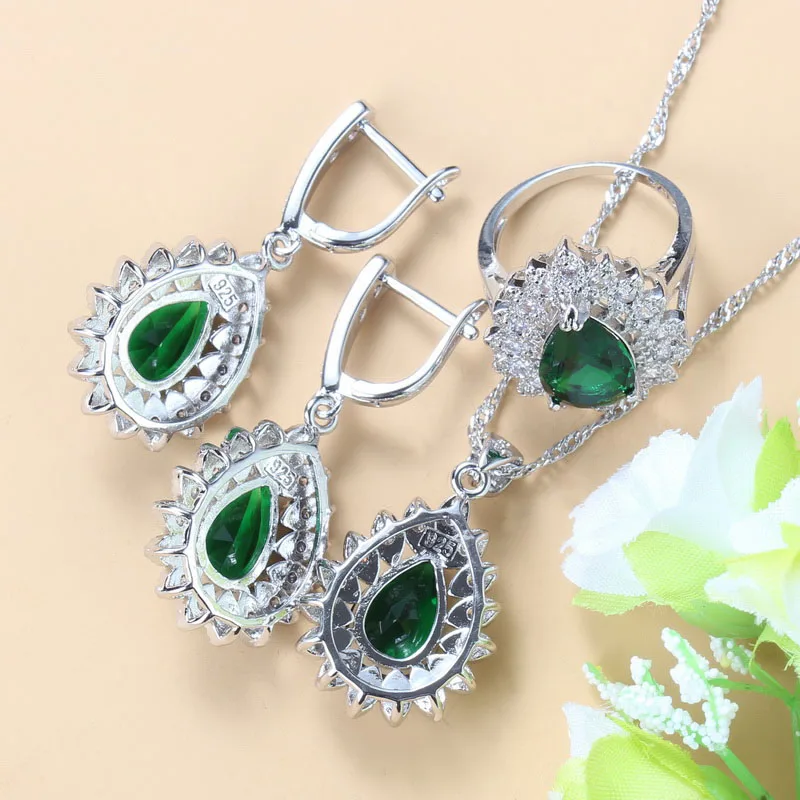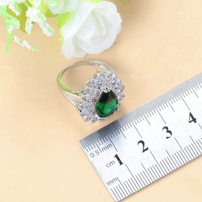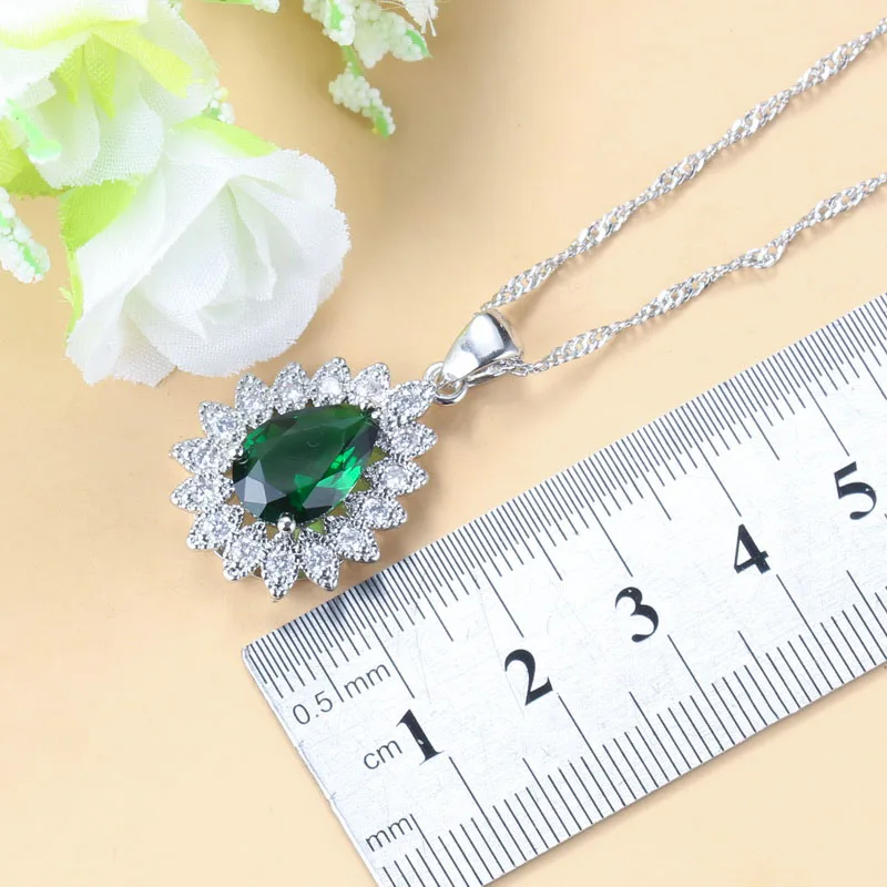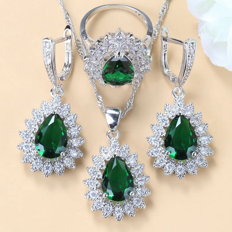 Свадебные Серебристые капли воды с натуральным камнем Циркон Зеленый Ювелирные наборы для женщин Свадебный костюм серьги кулон кольцо наборы