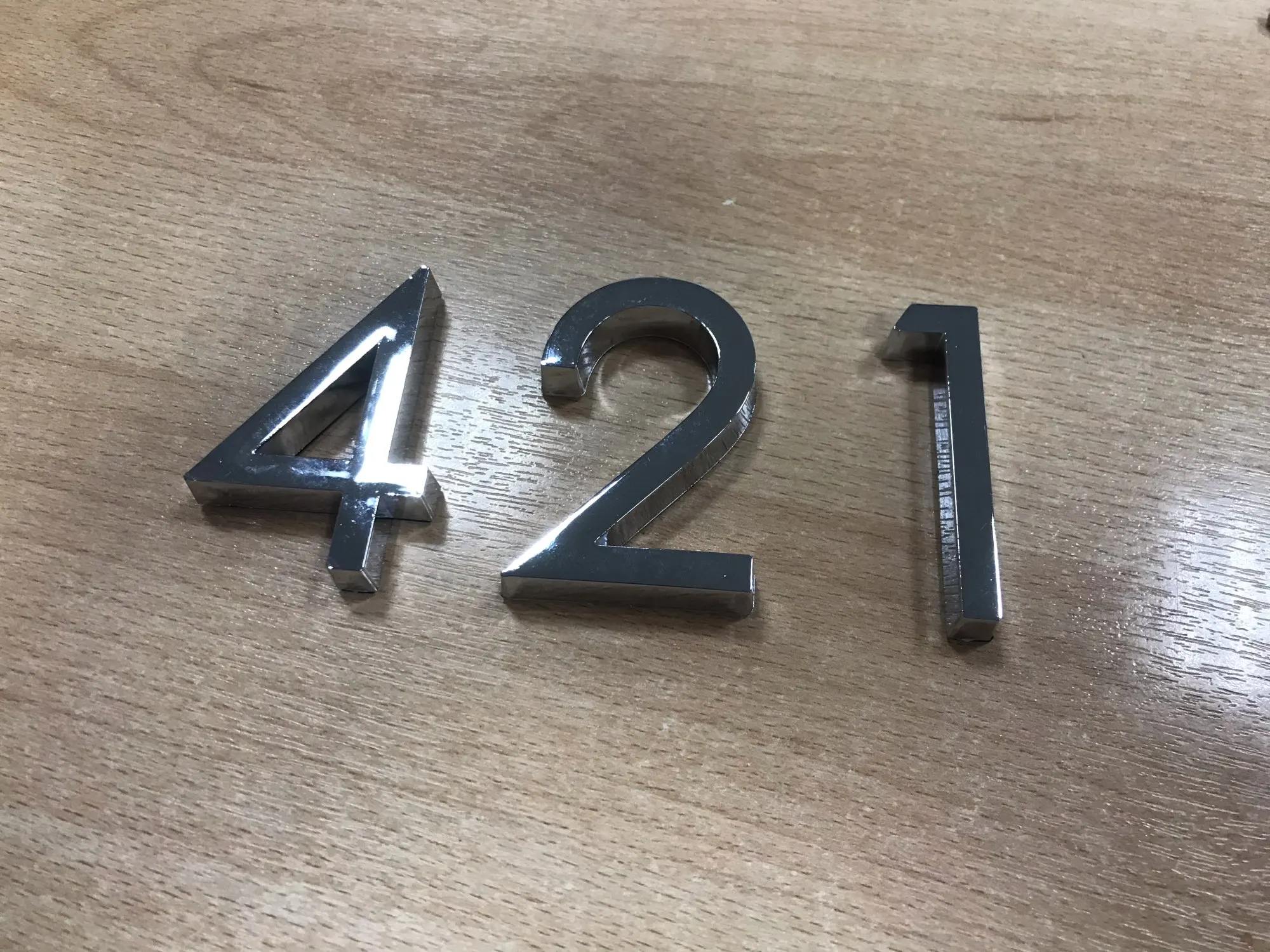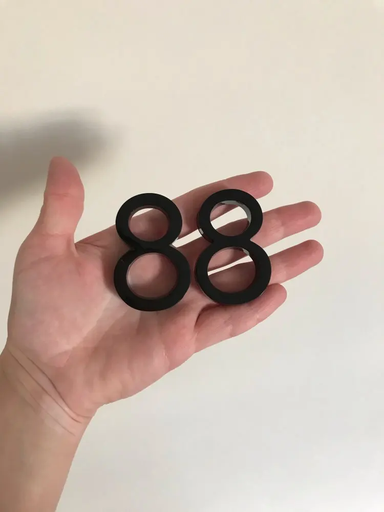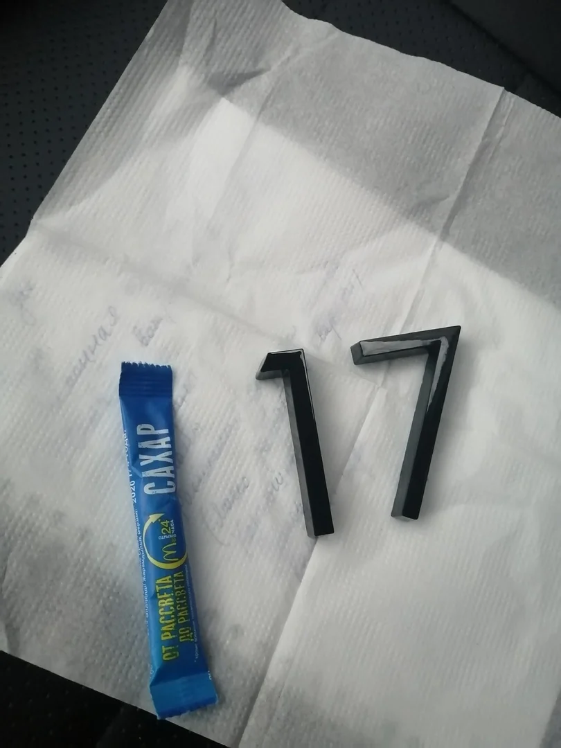 Один номер пришёл не много покоцанный, как будто б/у. Второй норм. Выглядят как на фото. По размеру не маленькие, для входных дверей в многоквартирном доме наверное большеваты, но это уже дело вкуса. А так пойдёт, хорошие цифры и клеятся и держатся отлично