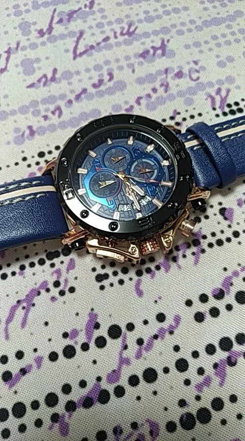 Доставка занимает всего 10 дней, часы были упакованы в почтовую упаковку. Как всегда, Часы поставляются в фирменной коробке и поставляются с тканью, инструкциями и гарантией на один год. Часы полностью покрыты защитной пленкой. Эта модель имеет очень стильный синий дизайн. Часы имеют рабочий хронограф, который можно включить, нажав на кнопку сбоку. Точечные часовые маркеры, эти маркеры и стрелки светятся в темноте. Есть небольшое окно с датой. Часы почти бесшумные, с кварцевым механизмом. Водонепроницаемость до 3 бар, закаленное стекло, очень рекомендуется