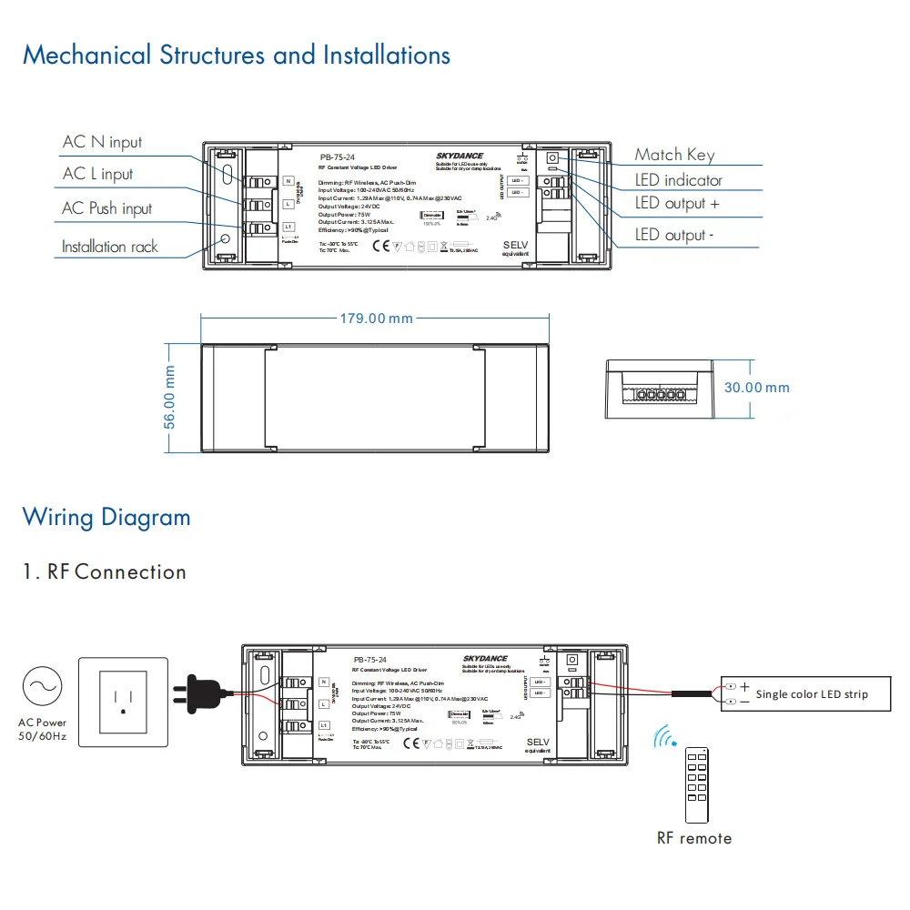 Механические конструкции и установкиСветодиодный драйвер постоянного напряжения RF● Интерфейс затемнения: RF Wireless, AC Push-Dim● Подходит для одного цветного пульта дистанционного управления Skydance 2,4G, один светодиодный радиочастотный драйвер принимает до 10 пультов дистанционного управления● Универсальный вход переменного тока/полный диапазон● 1 канал постоянного напряжения, Макс. Общая выходная мощность 75 Вт● Авто-функции передачи: светодиодный драйвер автоматически передает сигнал к другому светодиодный драйвер с возможностью погружения на глубину до 30 м дистанционное управление● Синхронизация нескольких Светодиодный драйверов● Защита от перегрева/перегрузки/короткого замыкания, восстановление автоматически● Полностью Защитный пластиковый чехол● Подходит для домашнего использования СВЕТОДИОДНЫЙ освещения● 5 лет, 50 000 часов гарантии