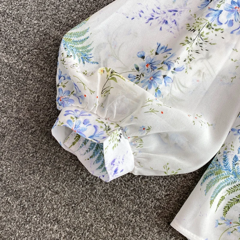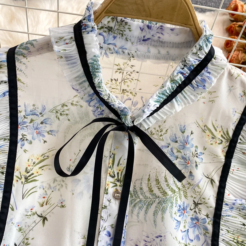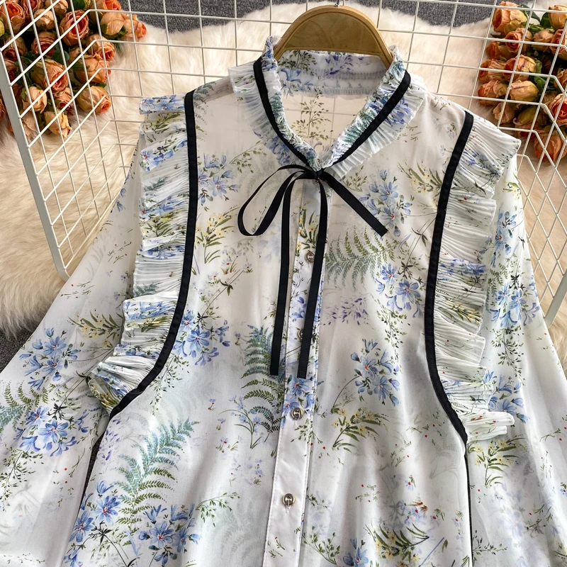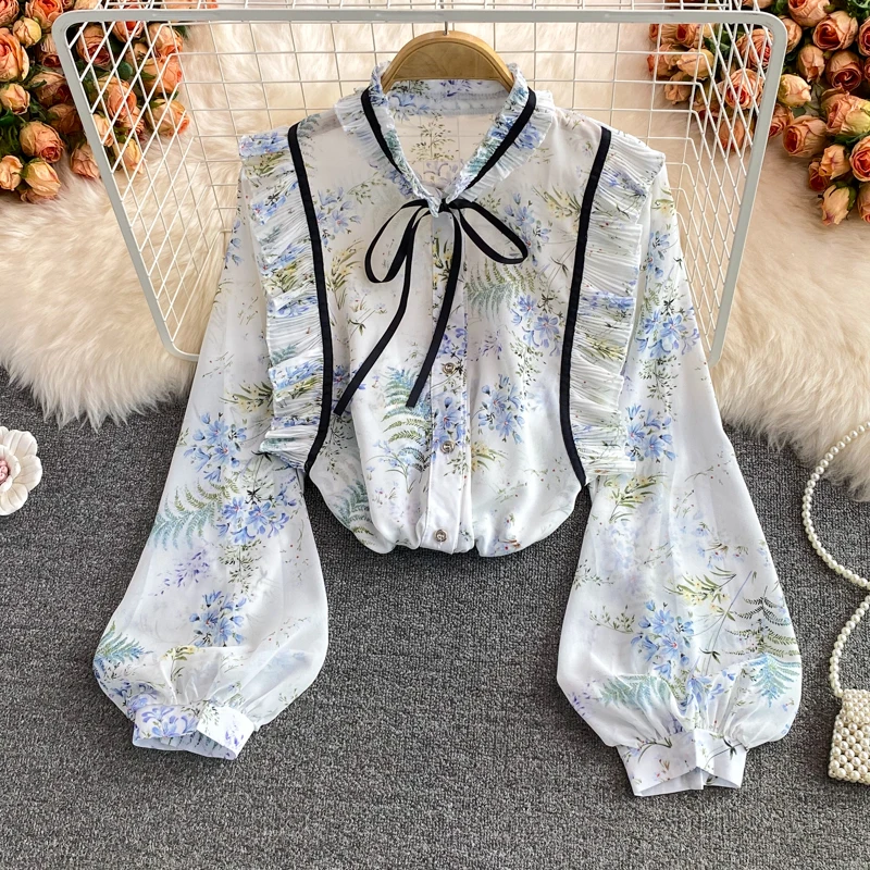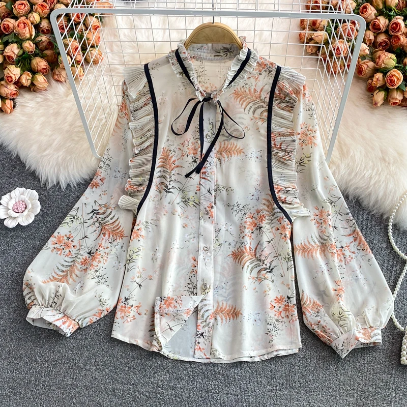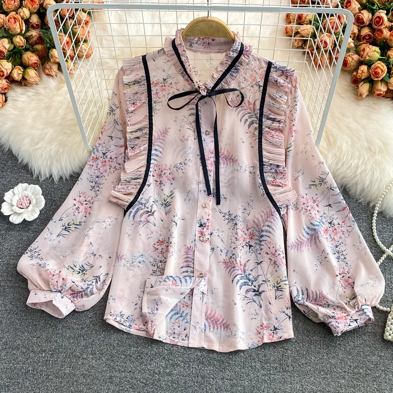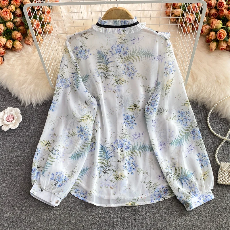 2022 женская шифоновая рубашка на весну и осень, милая рубашка с воротником-стойкой и длинным рукавом с принтом, топы, женские рубашки, блузки GD252