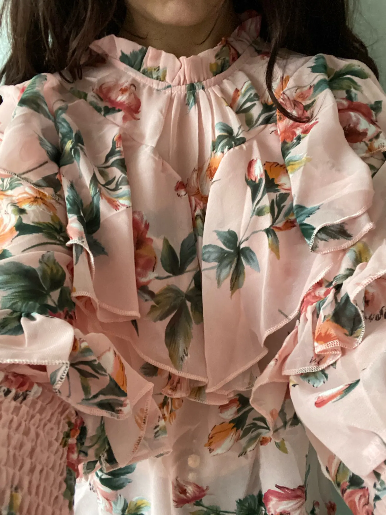 Блузка хорошая, приятная ткань, яркий рисунок. На размер 46 впритык. Но пару раз одену точно, смотрится красиво и стильно. Продавцу спасибо!