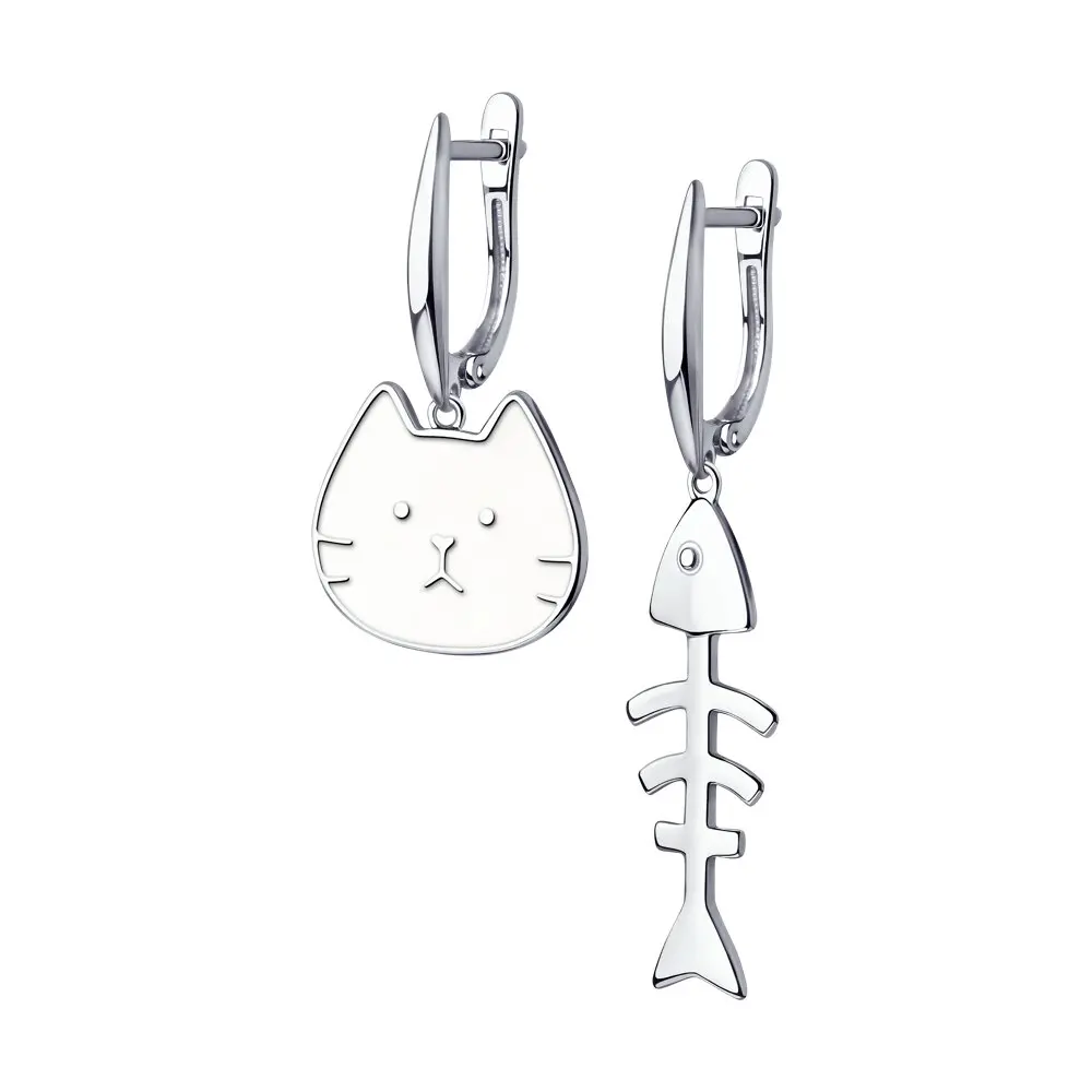 Серьги SOKOLOV из серебра с эмальюОстроумный дизайн этих серёг из серебра никого не оставит равнодушным. Если вам нравится привлекать внимание, обязательно присмотритесь к этой забавной парочке. Серьги отличаются не только длиной, но и деталями. Кошачьей мордочке придаёт выразительность цветная эмаль. А фигурка рыбки выделяется строгой геометрией линий. Можно носить эти серьги с джинсами, а можно – с любимым платьем и кедами.