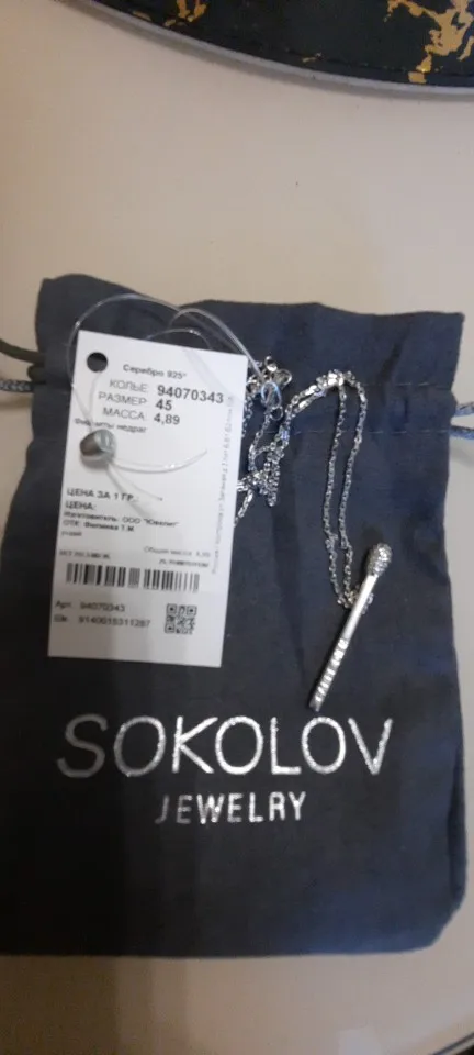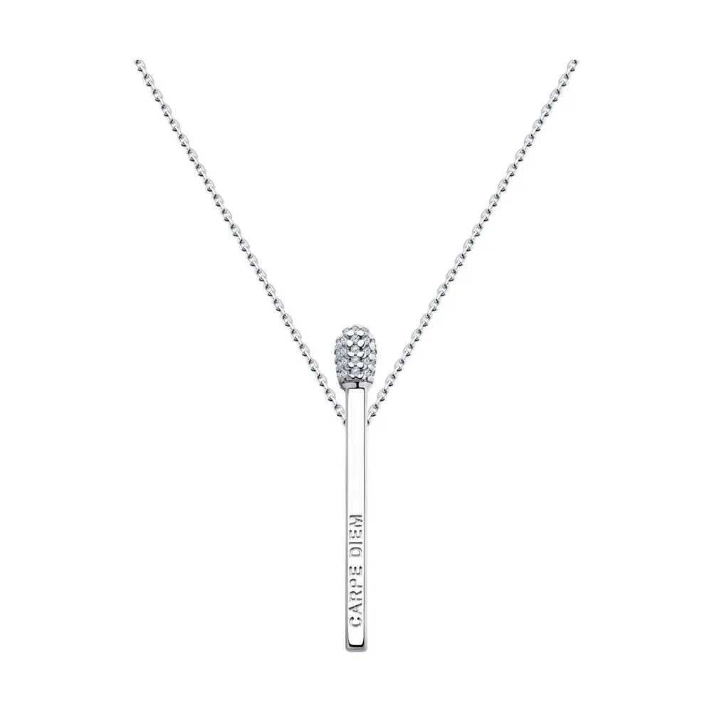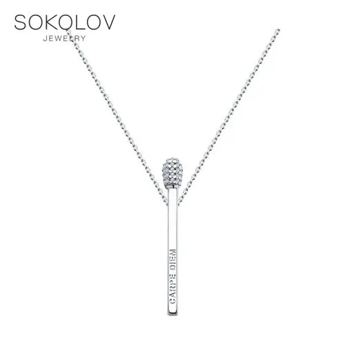 Колье «Спичка» SOKOLOV из серебра«Лови момент!» – философский посыл этого символичного колье с подвеской в виде серебряной спички с гравировкой на латыни придётся по вкусу активным девушкам, которые привыкли побеждать. Несмотря на оригинальную задумку, лаконичный дизайн с декором из сияющих фианитов позволяет носить украшение с совершенно разными по стилю образами. Вносите оригинальный акцент в будни или составляйте креативные сочетания для вечеринок.
