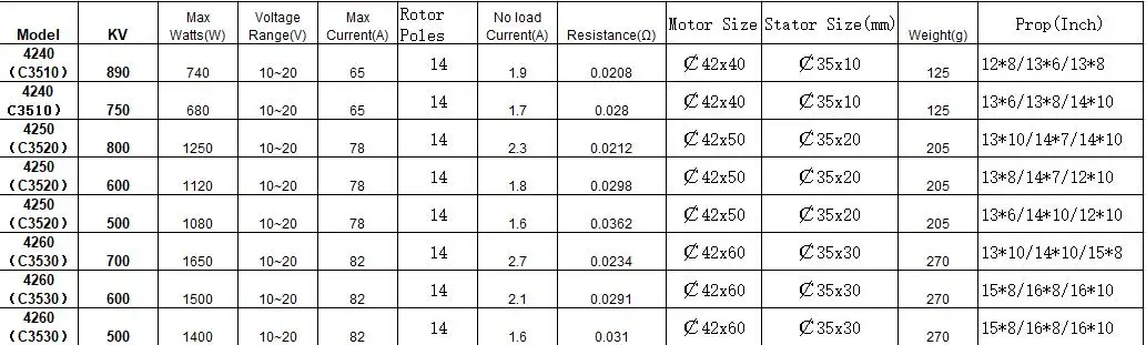Скорость вращения: 600 (кВ) об/мин/в Макс ватт (Вт):1120 Постоянный ток: 60A Макс. Ток 78A Входное напряжение: 10 - 20 в Без нагрузки ток: 1.8A Ротор полюсов: 14 Диаметр вала: 5x73,5 мм (Д × л) Внутреннее сопротивление: 0,0298 (Ω) Вес двигателя: 205 г (без аксессуаров) Размеры мотора (диаметр x длина) :42 мм x 50 Размеры пропеллера: 13*8/14*7/12*10 Тип входного аккумулятора: NiCd/ Nimh/ Li-po аккумулятор Рекомендуемая модель: самолет