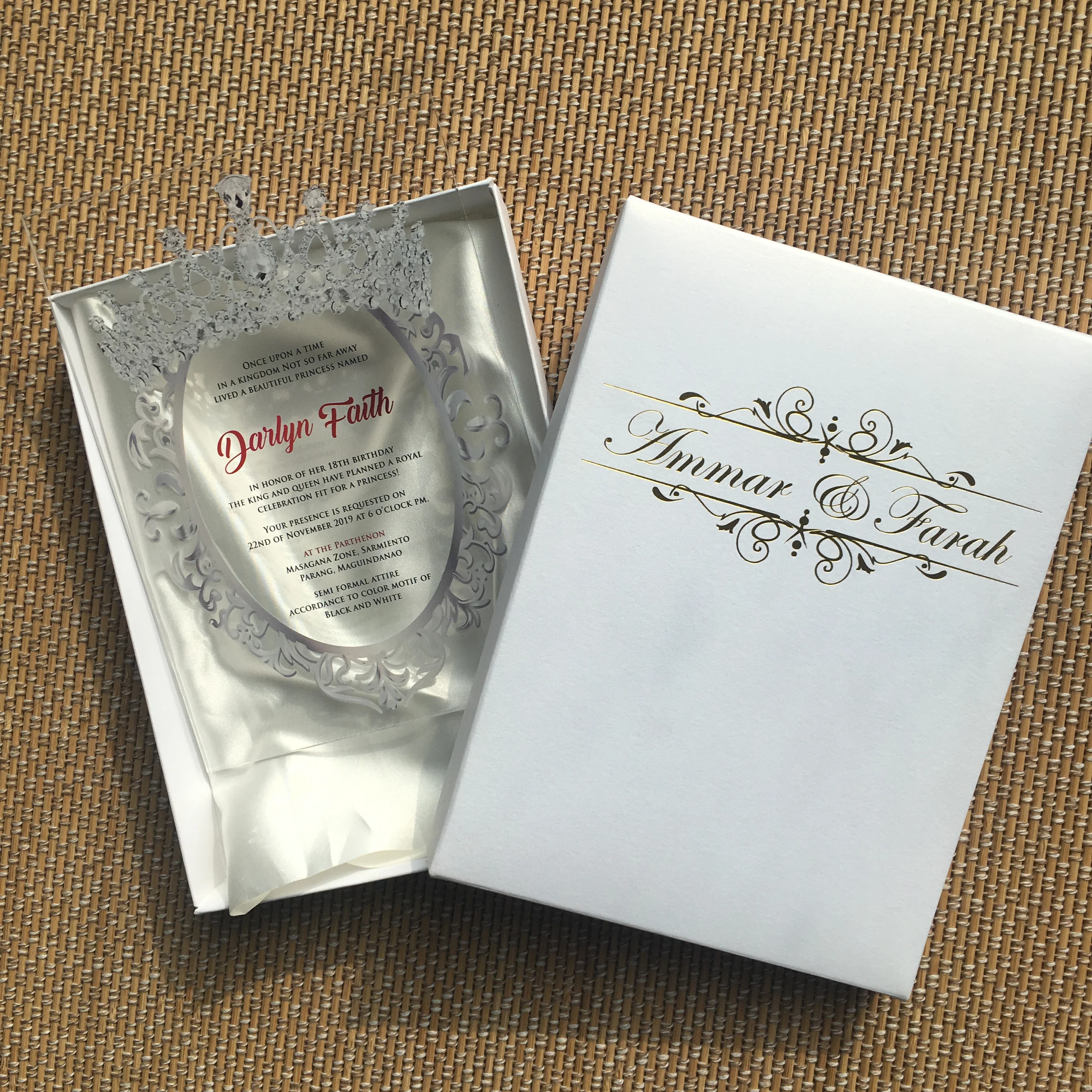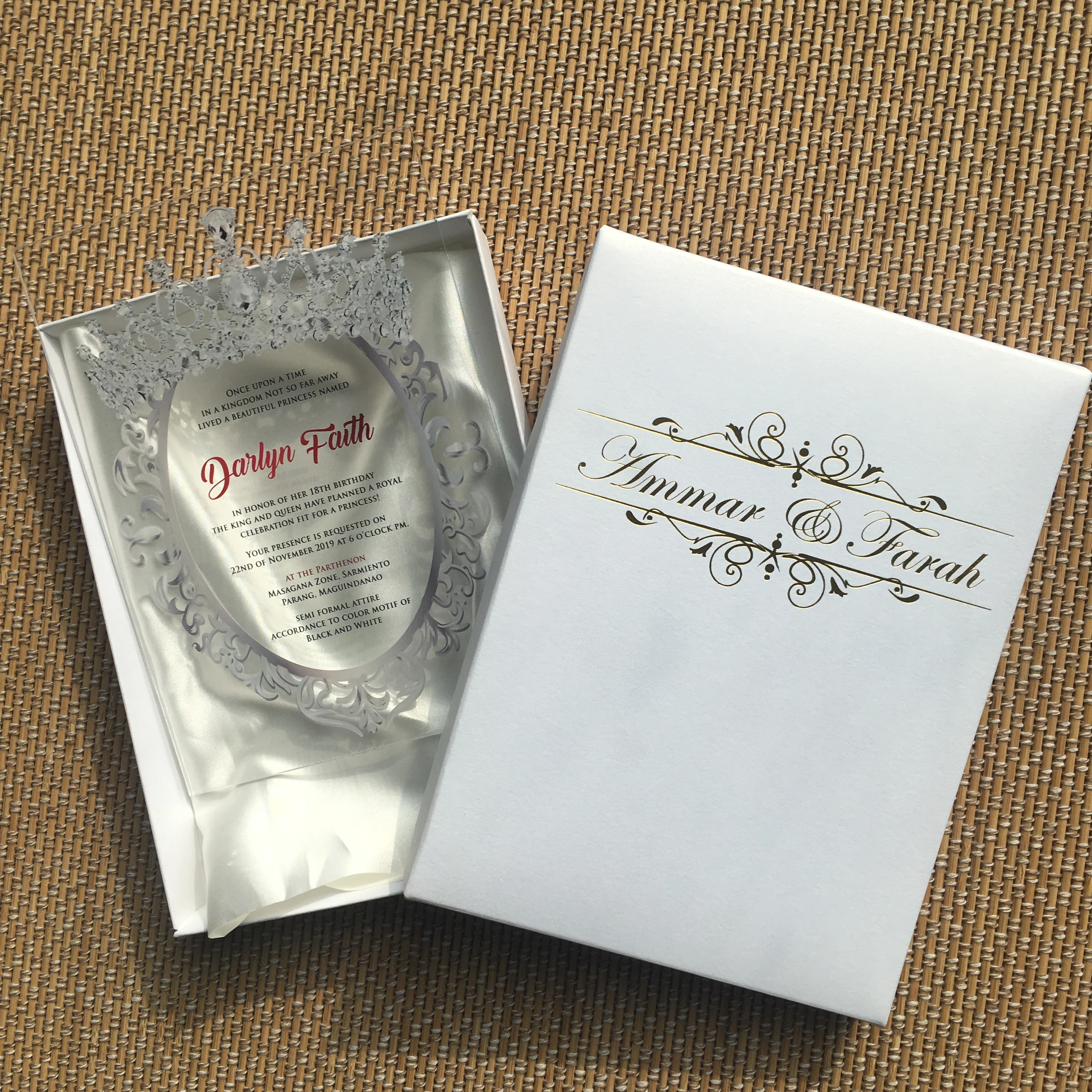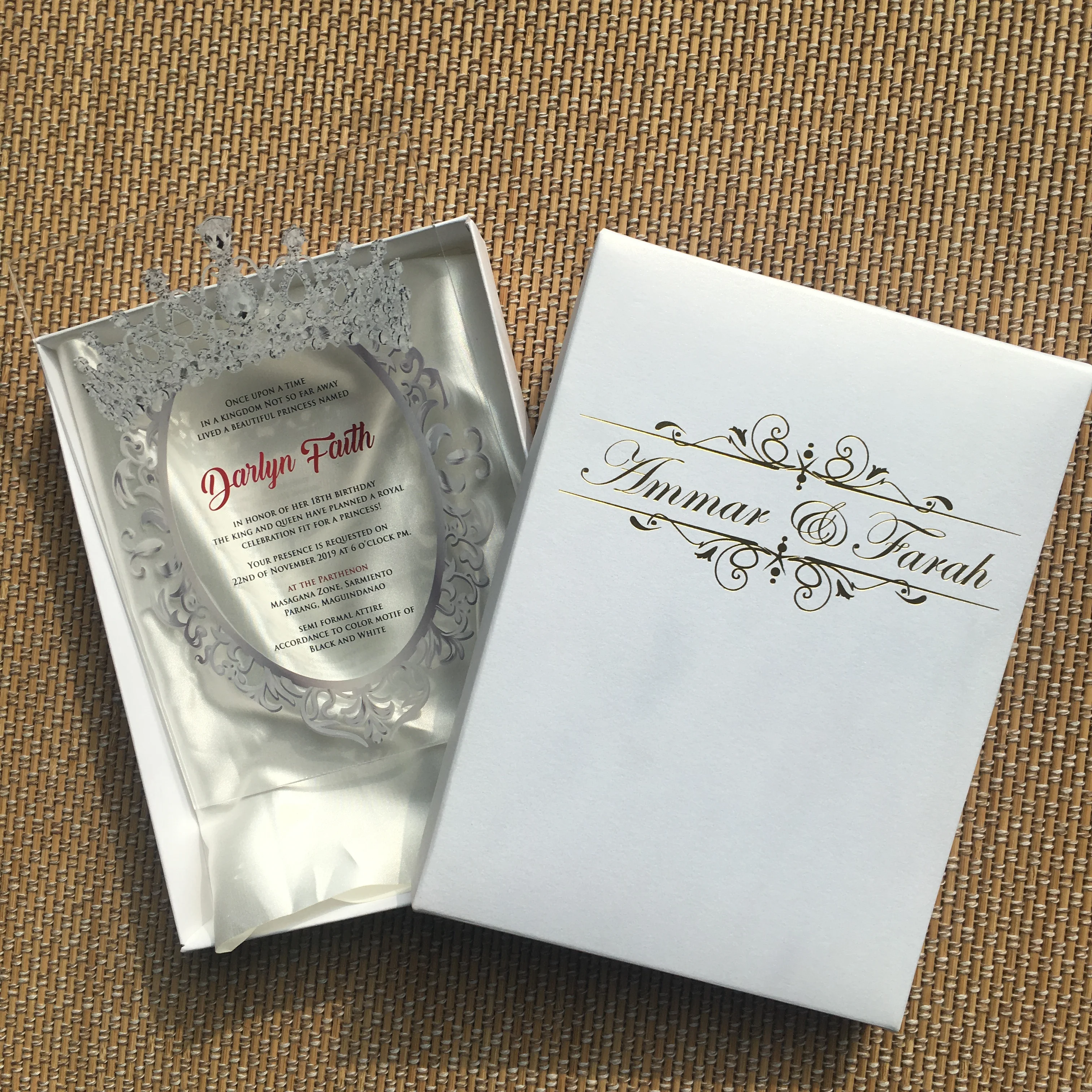 Свадебное приглашение, акриловое, в форме короны, с тканью и коробкой