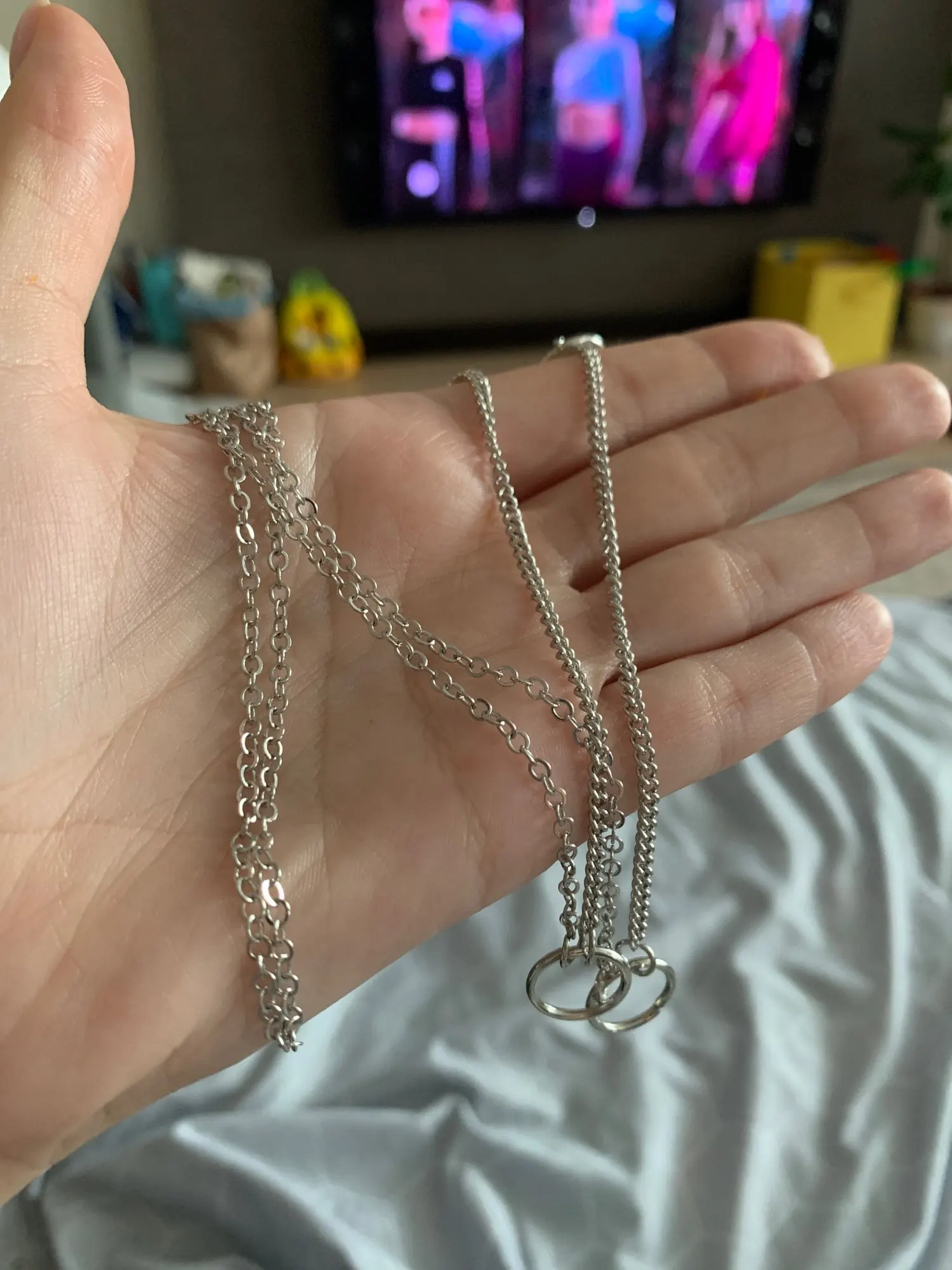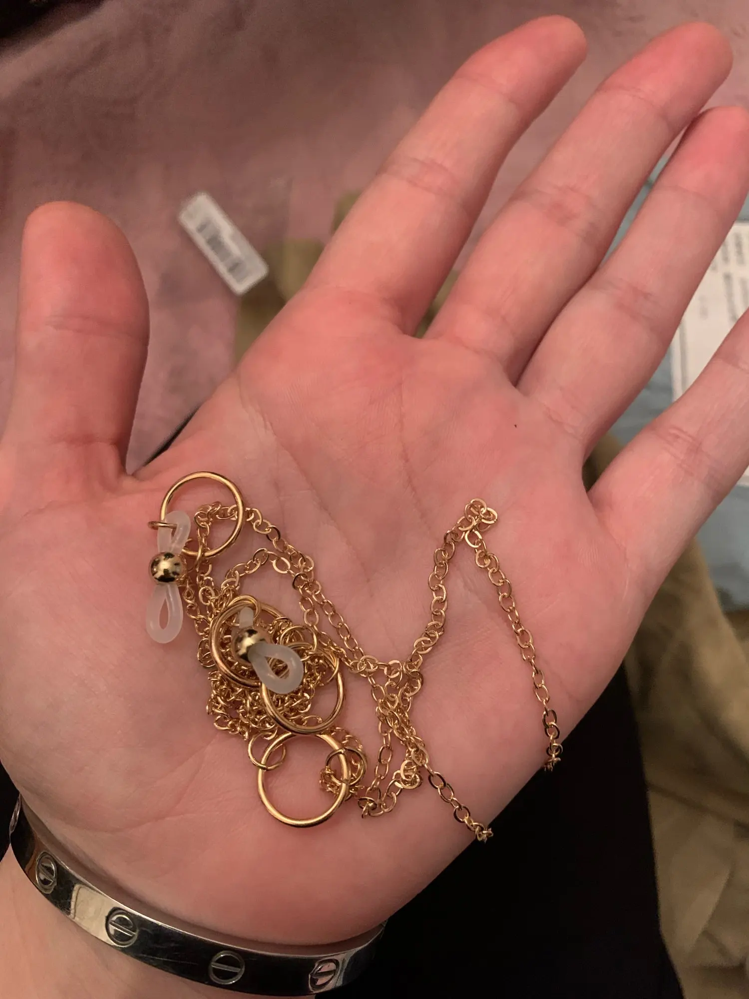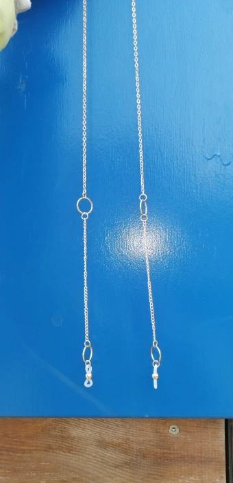 Цепочки хорошие, смотрятся очень красиво. Но большой минус - при постоянном использовании на очках для зрения они чернеют через пару месяцев, особенно на том месте, где прикасаются к шее. Ещё их лучше протирать чем-то, если постоянно носите, потому что на ней скапливается грязь и там, где она прикасается к лицу могут начаться высыпания.