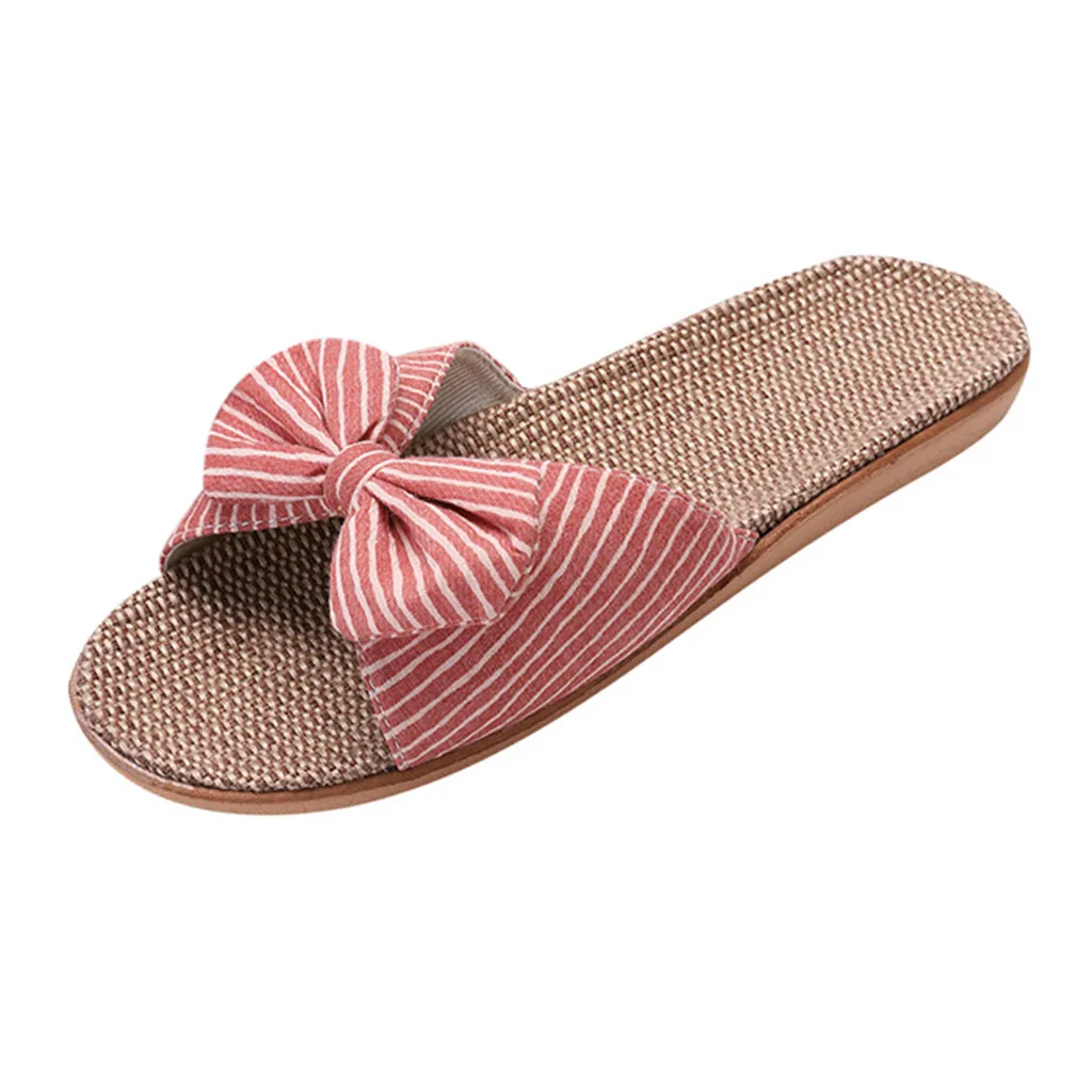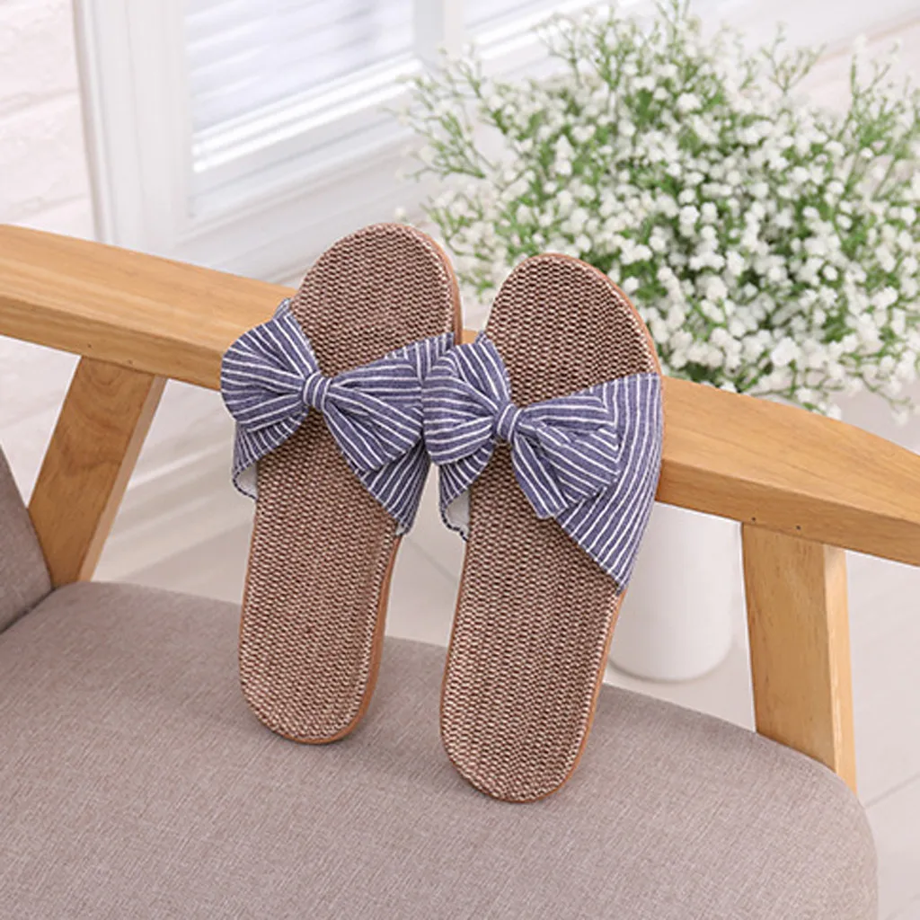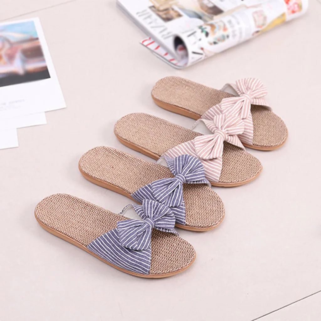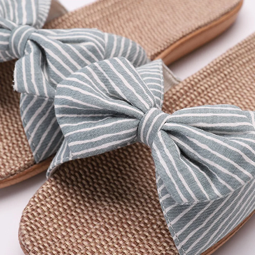 Домашние женские льняные Вьетнамки с бантом; пляжная обувь; сандалии; шлепанцы; женские слипоны на плоской подошве; женские сандалии в полоску