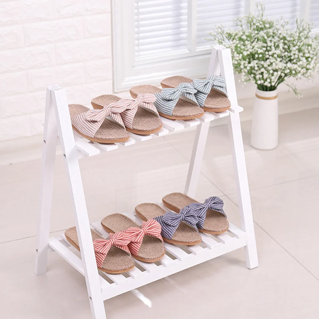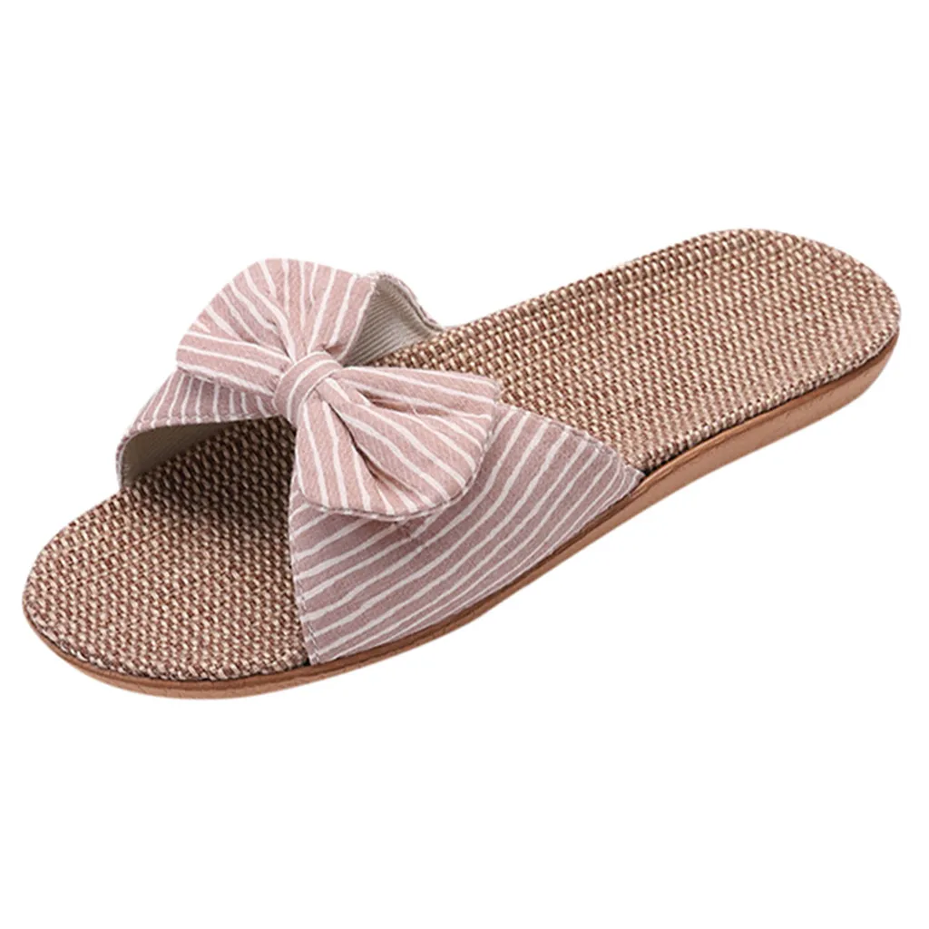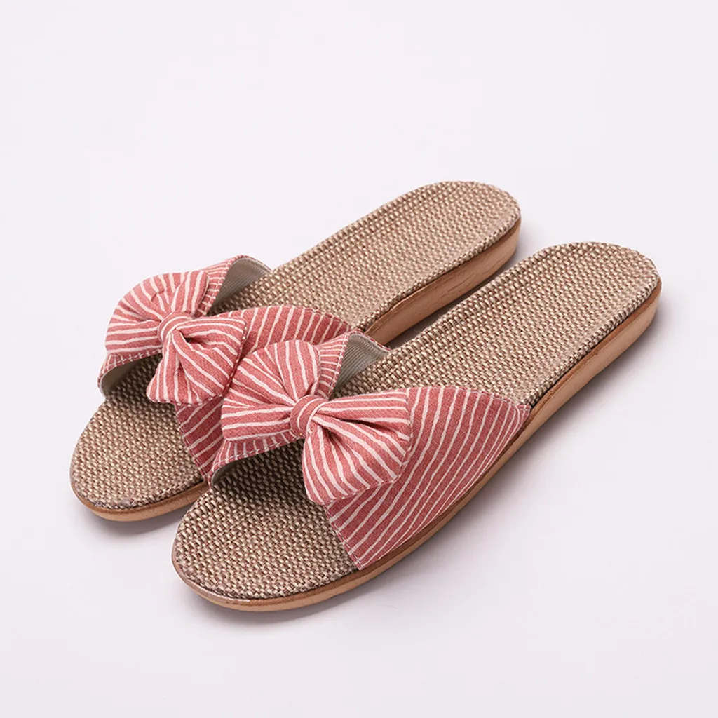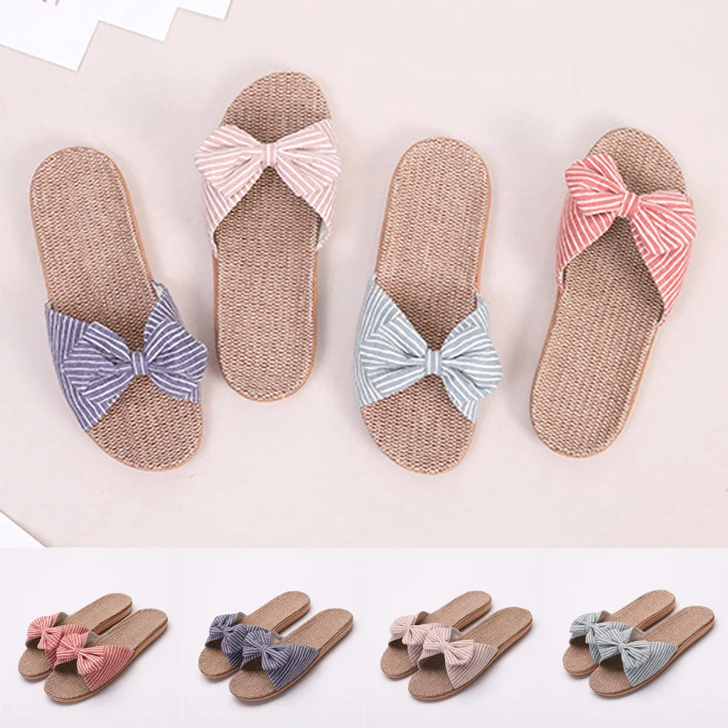 Домашние женские льняные Вьетнамки с бантом; пляжная обувь; сандалии; шлепанцы; женские слипоны на плоской подошве; женские сандалии в полоску