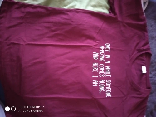 bestial!!!!! genial!!!! calidad buenísima. talla perfecta, dibujo bien impreso. super contenta!!!! rojo más oscuro pero no importa.......recomiendo.