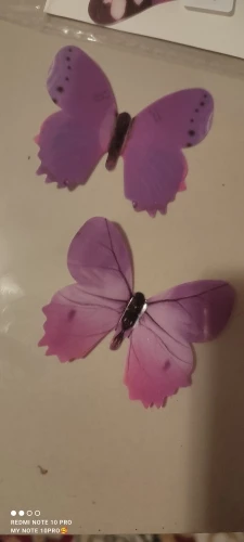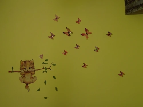 прикольні метелики. я мабуть думала вони якісь трішки інші) я думала вони розмальовані з обох сторін, а насправді принт нанесено на метеликів тільки з однієї сторони, якщо дивитись збоку на стіну то вони білі. але пропінені наліпки для фіксування, стіни мабуть тримаються краще ніж метеликів ) через два тижні один метелик злетів а наліпка залишилась на стіні.