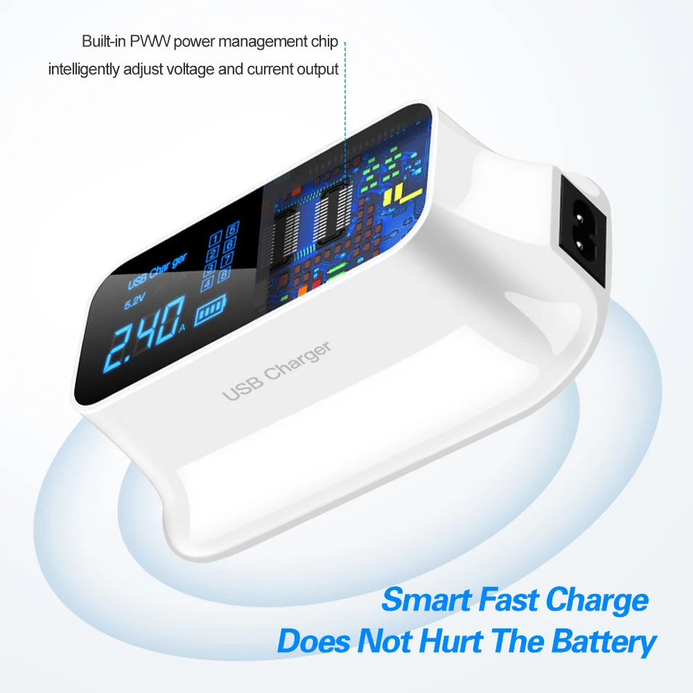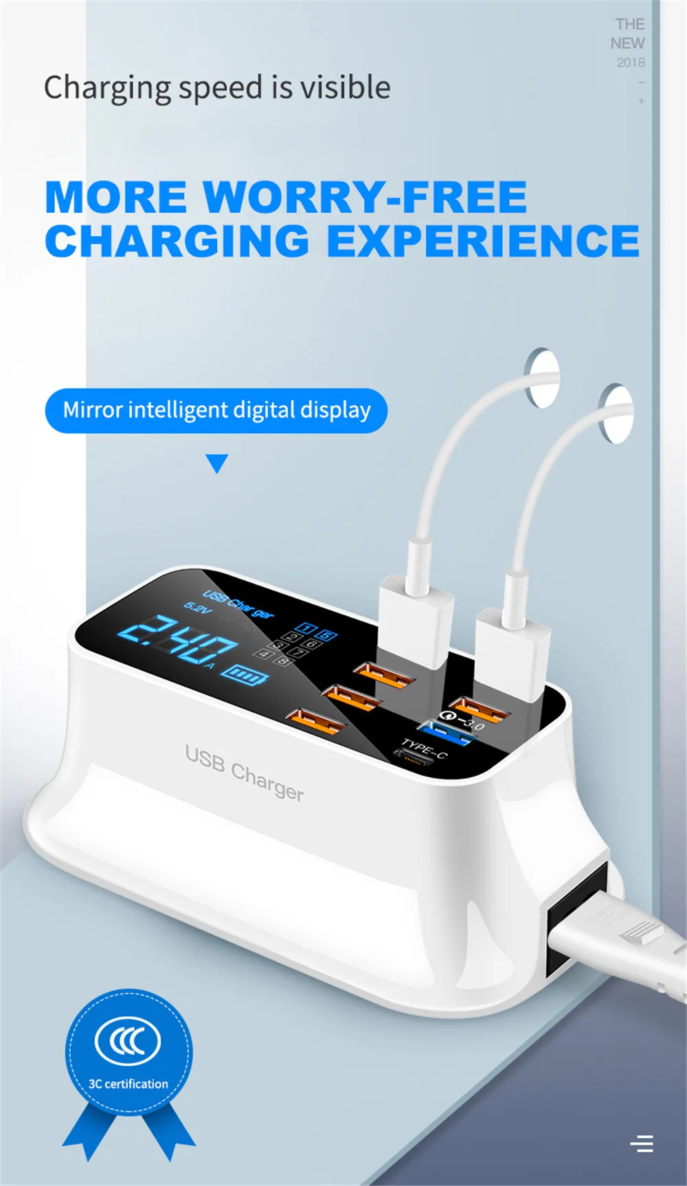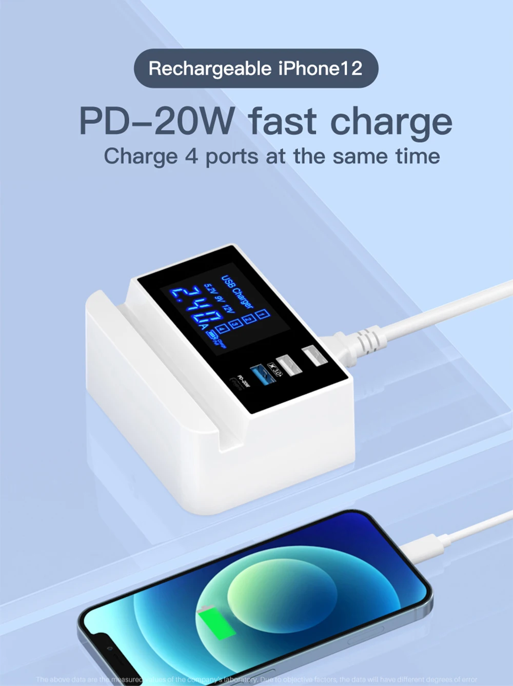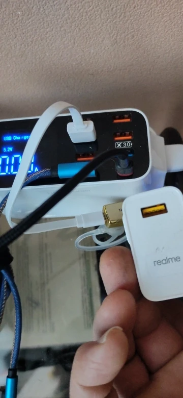 Отличная зарядка. Пробовал 3 телефона заряжать одновременно, тащит без проблем. Указывает ток зарядки каждого потребителя. Заряжает быстро. На дисплее 5.2 вольта. Ставил HONOR 20 Lite на зарядку, берет 1.45 А, по мере увеличения значения заряда, на телефоне, к примеру 80-95%, ток уменьшается. В общем отличная штука, теперь занята 1 розетка, вместо 4.