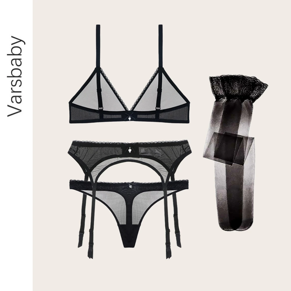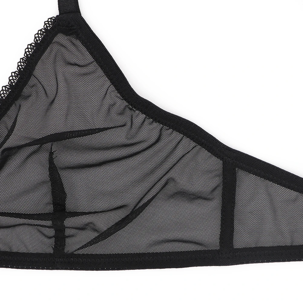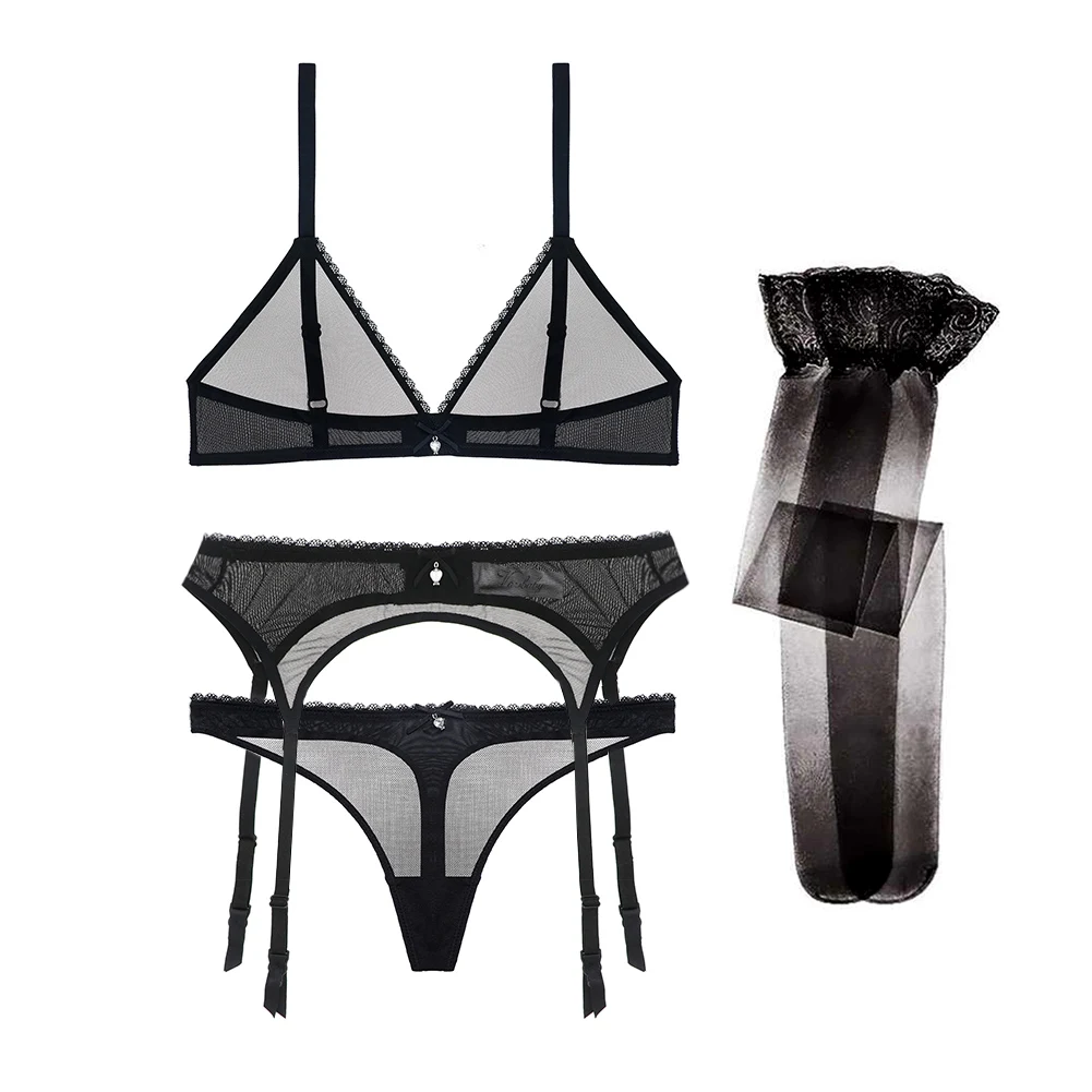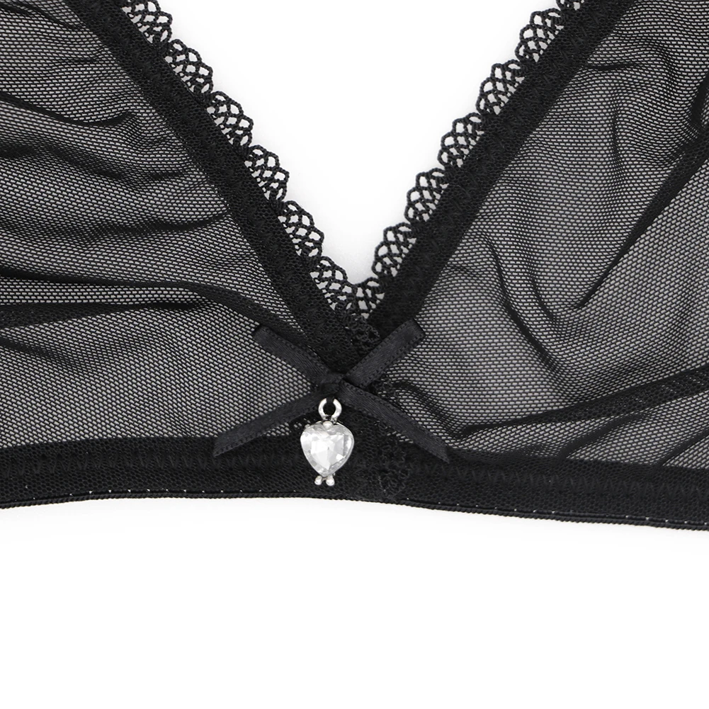 Комплект женского нижнего белья из бюстгальтера, стрингов, подвязки и чулок, прозрачный, без косточек, с глубоким V-образным вырезом