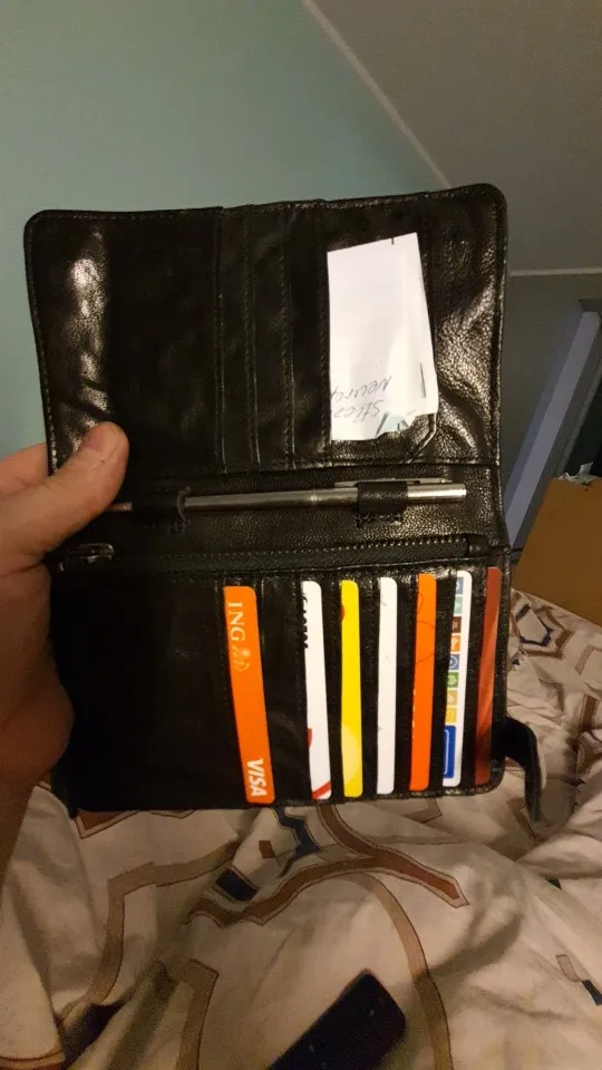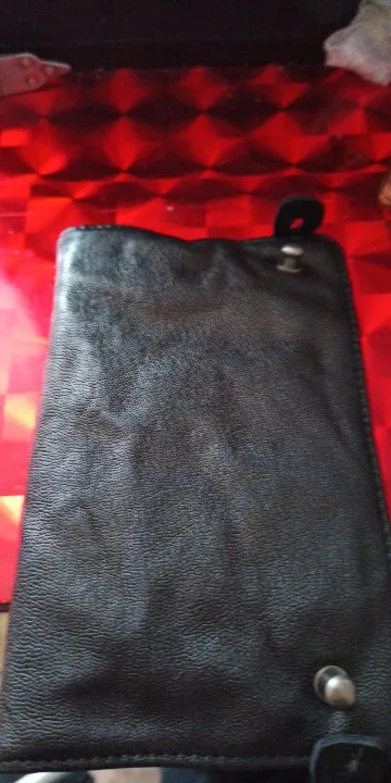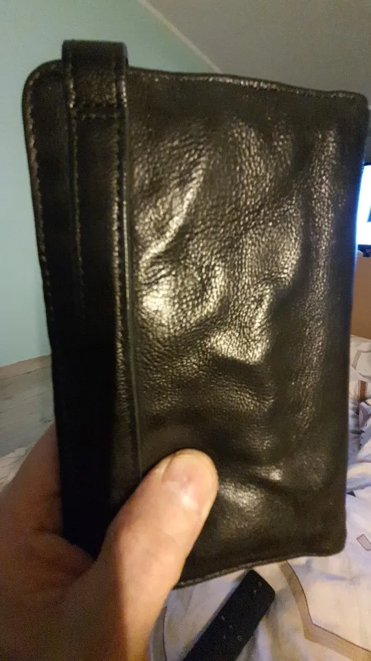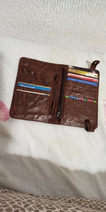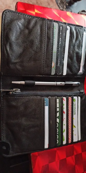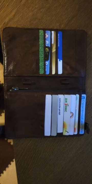 Шел до Москвы менее 2х недель. Штука из очень плотной кожи, на ощупь и при осмотре качества - вызывает доверие, кожа сомнений не вызывает, пахнет нормально как для такого изделия. Кому то может показаться что карты плотно сидят. Застежки со временем сами открываться не должны. Товар понравился, цена-качество *****