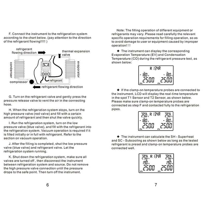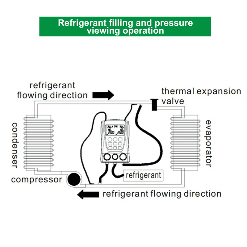 Интеллектуальный электронный хладагент-это вспомогательный инструмент для установки, тестирования и обслуживания холодильного оборудования, такого как кондиционеры и холодильное хранилище. Прибор имеет двойной тест давления, двойной температурный тест (нужен тестовый зажим, не входит в комплект), цифровое считывание, многофункциональное переключение, многофункциональная функция и встроенная база данных хладагента. В приборе используются высокопрочные инженерные пластмассы и гибкий нескользящий Силиконовый дизайн, вся машина прочная и удобная для удержания. Встроенный 32-битная цифровая обработка блок и высокой точности система сбора и обработки данных блок, которые ставят высокие данные и стабильности во всем мире. Большой размер жидкокристаллического дисплея, ЖК-дисплей задняя светильник поддержки, отображение данных четкий и удобный для чтения, удобный светильник операции. Долговечный клапан, 1/4 дюймовый стандартный дизайн интерфейса для обеспечения долговечности и универсальности прибора.Прибор может измерять двойное давление (манометрическое давление) одновременно, а также двойное измерение температуры (требуется тестовый зажим, не входит в комплект), с автоматическим мульти-единичным преобразованием давления, автоматическое преобразование температуры Цельсия/Фаренгейта, чтобы облегчить различные потребности. Встроенный 89 видов хладагента давления-испарения температуры базы данных, также рассчитать перегрев охлаждения, чтобы облегчить прямое считывание данных рабочих процессов. Также он проверяет процент измерения вакуума; Измерение утечки давления, запись Скорости времени утечки. Заслуживает того, чтобы этот многофункциональный, точный и просто управляемый цифровой коллектор позволял вам делать работу правильно.