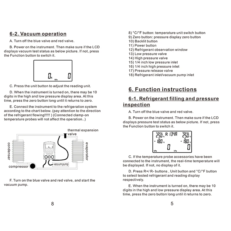 (1) Вход низкого давления 1/4 дюйма(2)1/4 дюймовый вход высокого давления(3) клапан сброса давления(4) вход хладагента/вход вакуумного насоса(5) гнездо датчика температуры с зажимом(6) гнездо датчика температуры с зажимом(7) дизайн крючка(8) клапан низкого давления(9) окно наблюдения хладагента(10) клапан высокого давления(11) дисплей кнопки(12) светодиодный дисплей