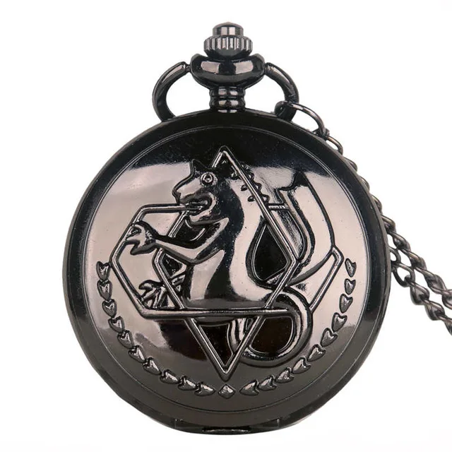 Модные полностью Металлические кварцевые карманные часы для косплея алхимика Эдварда Элрика, винтажные черные часы с подвеской на ожерелье, мужские и женские часы на цепочке