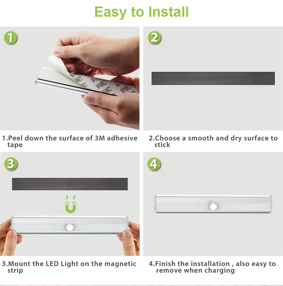Перезаряжаемая батарея: Этот светильник с датчиком движения питается от встроенной перезаряжаемой батареи, ее можно заряжать через USB-кабель или USB-порт. Перезаряжаемый аккумулятор большой емкости 500 мАч, работает дольше