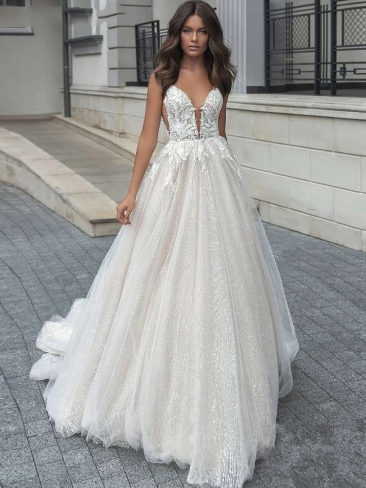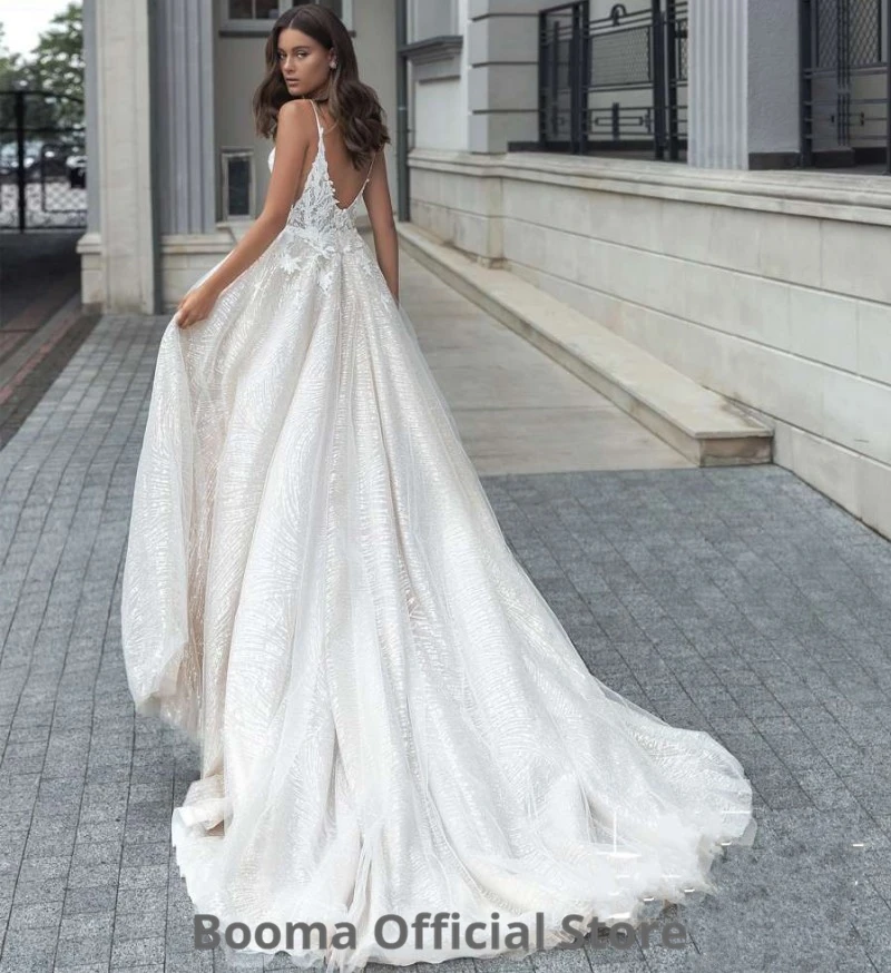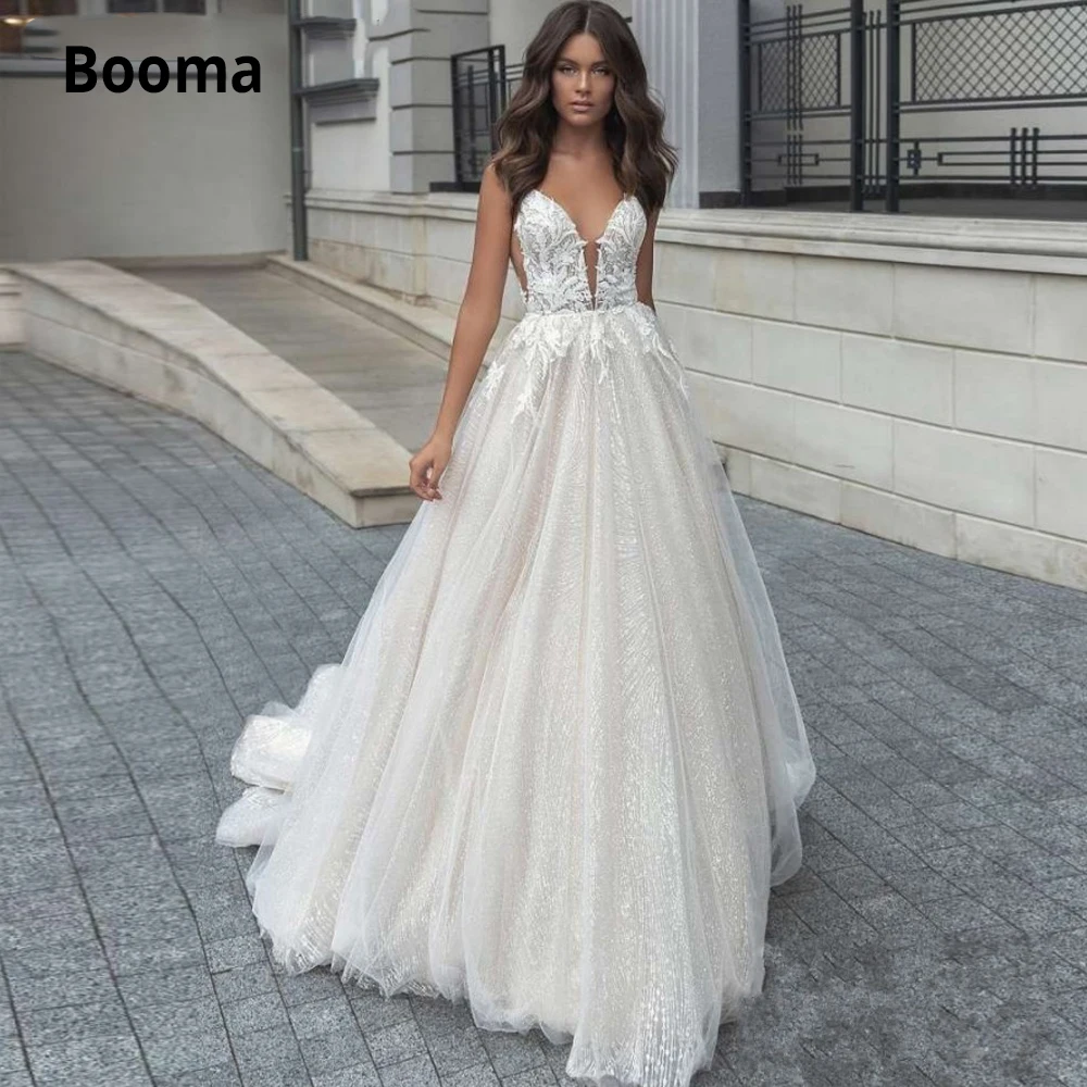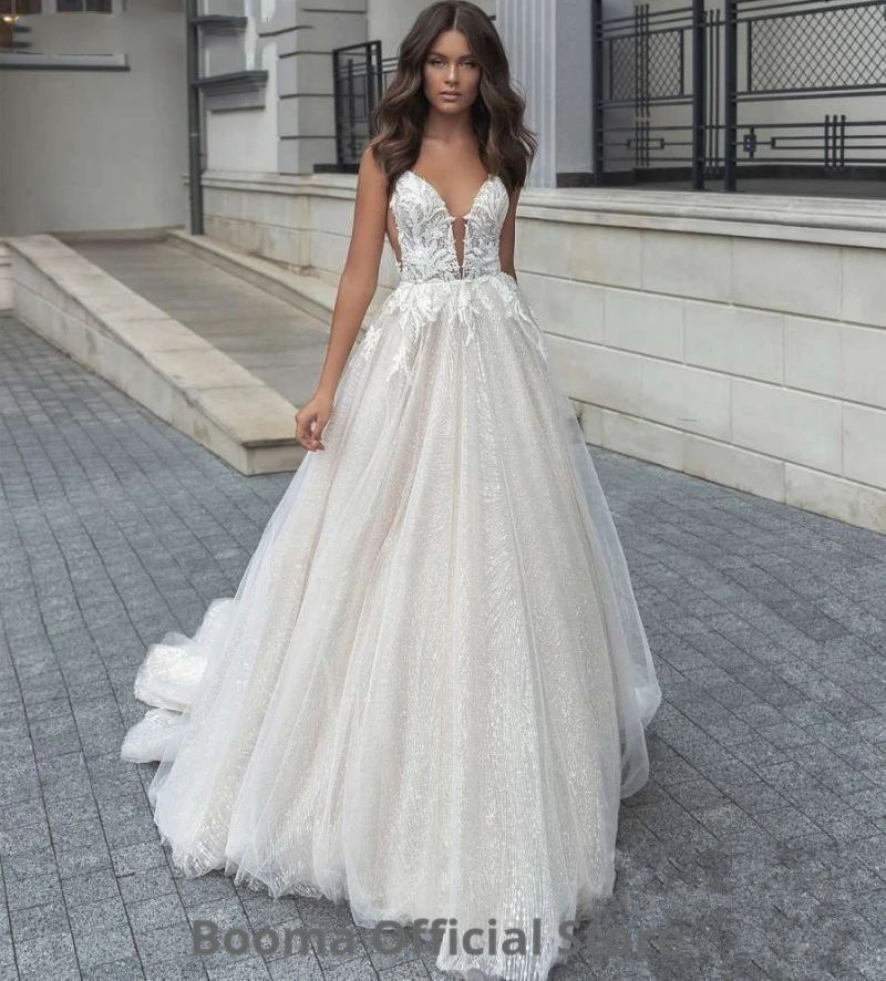 Boomaкружевные свадебные платья с глубоким v-образным вырезом, без рукавов, фатиновые Свадебные платья принцессы, Пляжное свадебное платье, вечернее платье со шлейфом